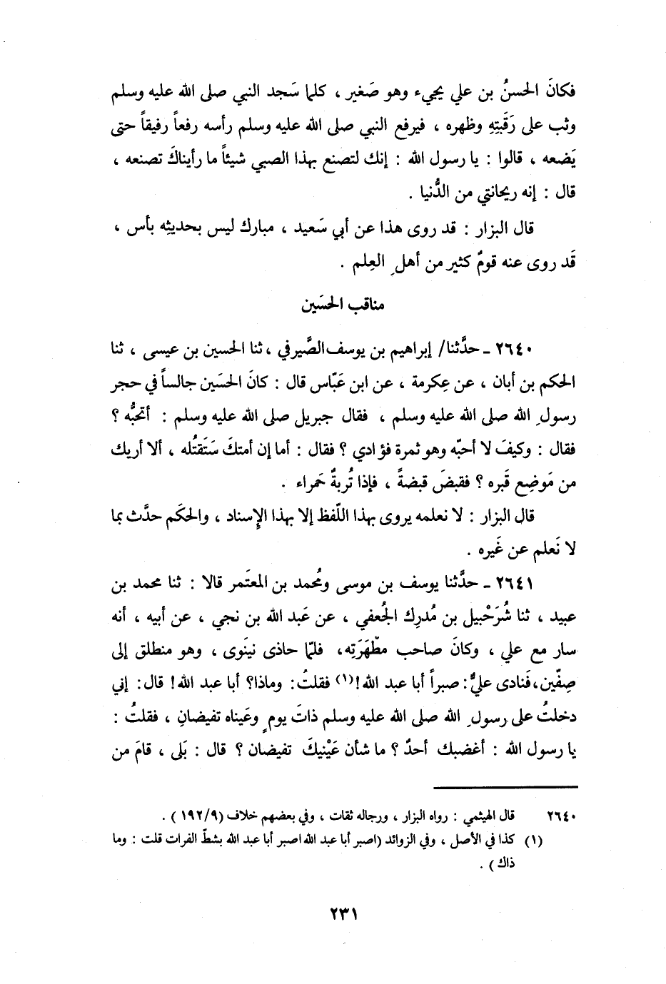 2640 - حَدَّثَنَا إِبْرَاهِيمُ بْنُ يُوسُفَ الصَّيْرَفِيُّ، ثنا الْحُسَيْنُ بْنُ عِيسَى، ثنا الْحَكَمُ بْنُ أَبَانٍ، عَنْ عِكْرِمَةَ، عَنِ ابْنِ عَبَّاسٍ قَالَ: كَانَ الْحُسَيْنُ جَالِسًا فِي حِجْرِ رَسُولِ اللَّهِ صَلَّى اللَّهُ عَلَيْهِ وَسَلَّمَ، فَقَالَ: جِبْرِيلُ صَلَّى اللَّهُ عَلَيْهِ وَسَلَّمَ: أَتُحِبُّهُ؟ فَقَالَ: «وَكَيْفَ لا أُحِبُّهُ وَهُوَ ثَمَرَةُ فُؤَادِي؟» فَقَالَ: أَمَا إِنَّ أُمَّتَكَ سَتَقْتُلُهُ، أَلا أُرِيكَ مِنْ مَوْضِعِ قَبْرِهِ؟ فَقَبَضَ قَبْضَةً، فَإِذَا تُرْبَةٌ حَمْرَاءُ.