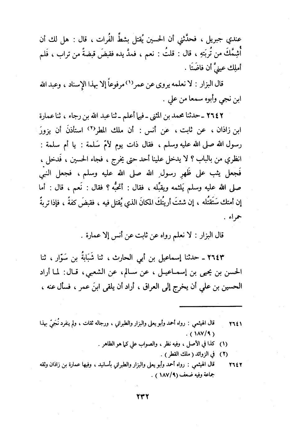 2642 - حَدَّثَنَا مُحَمَّدُ بْنُ الْمُثَنَّى - فِيمَا أَعْلَمُ - ثنا عَبْدُ اللَّهِ بْنُ رَجَاءٍ، ثنا عُمَارَةُ بْنُ زَاذَانَ، عَنْ ثَابِتٍ، عَنْ أَنَسٍ: أَنَّ مَلَكَ الْمَطَرِ اسْتَأْذَنَ أَنْ يَزُورَ رَسُولَ اللَّهِ صَلَّى اللَّهُ عَلَيْهِ وَسَلَّمَ، فَقَالَ ذَاتَ يَوْمٍ لأُمِّ سَلَمَةَ: " يَا أُمَّ سَلَمَةَ: انْظُرِي مِنَ الْبَابِ؟ لا يَدْخُلُ عَلَيْنَا أَحَدٌ حَتَّى يَخْرُجَ " فَجَاءَ الْحُسَيْنُ، فَدَخَلَ، فَجَعَلَ يَثِبُ عَلَى ظَهْرِ رَسُولِ اللَّهِ صَلَّى اللَّهُ عَلَيْهِ وَسَلَّمَ، فَجَعَلَ النَّبِيُّ صَلَّى اللَّهُ عَلَيْهِ وَسَلَّمَ يَلْثِمُهُ وَيُقَبِّلُهُ، فَقَالَ: أَتُحِبُّهُ؟ فَقَالَ: «نَعَمْ» قَالَ: أَمَا إِنَّ أُمَّتَكَ سَتَقْتُلُهُ، إِنْ شِئْتَ أَرَيْتُكَ الْمَكَانَ الَّذِي يُقْتَلُ فِيهِ، فَقَبَضَ كِفَّةً، فَإِذَا تُرْبَةٌ حَمْرَاءُ.