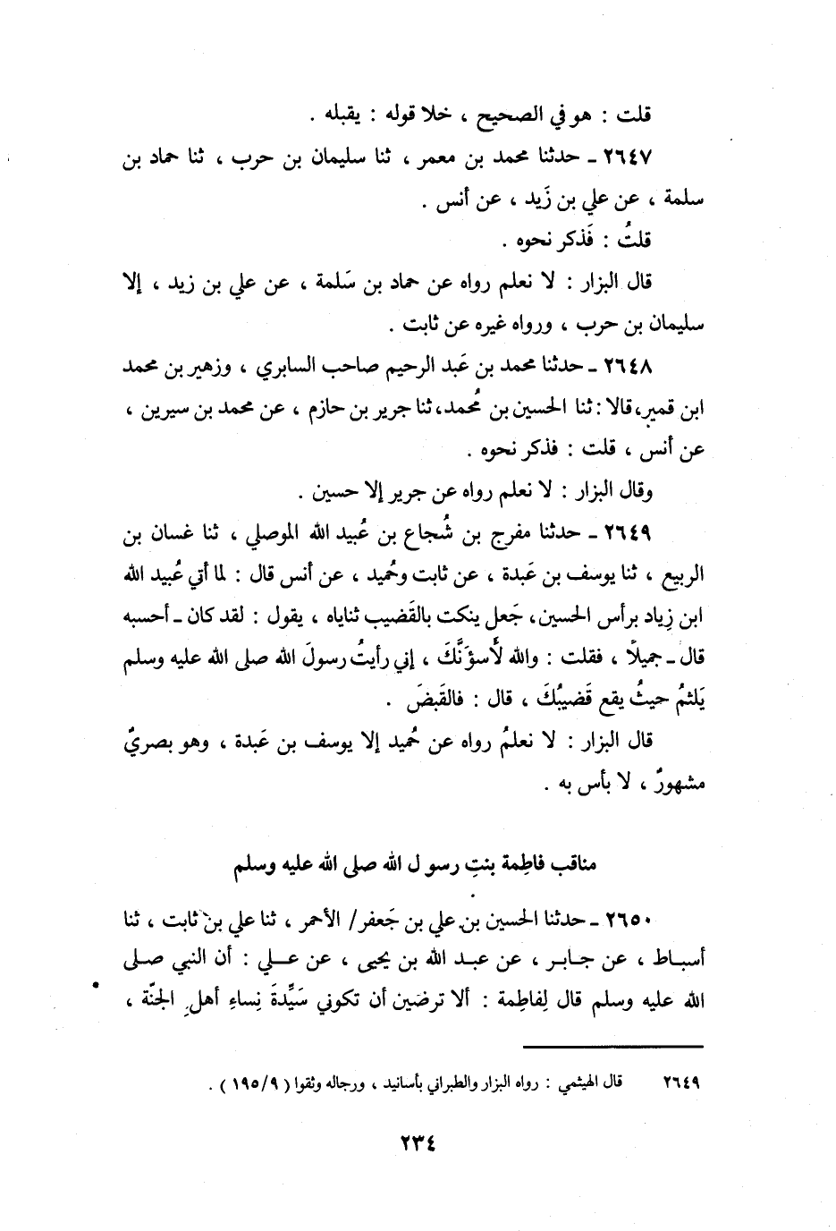 2650 - حَدَّثَنَا الْحُسَيْنُ بْنُ عَلِيِّ بْنِ جَعْفَرٍ الأَحْمَرُ، ثنا عَلِيُّ بْنُ ثَابِتٍ، ثنا أَسْبَاطٌ، عَنْ جَابِرٍ، عَنْ عَبْدِ اللَّهِ بْنِ نُجَيٍّ، عَنْ عَلِيٍّ: أَنَّ النَّبِيَّ صَلَّى اللَّهُ عَلَيْهِ وَسَلَّمَ قَالَ لِفَاطِمَةَ: «أَلا تَرْضِينَ أَنْ تَكُونِي سَيِّدَةَ نِسَاءِ أَهْلِ الْجَنَّةِ،