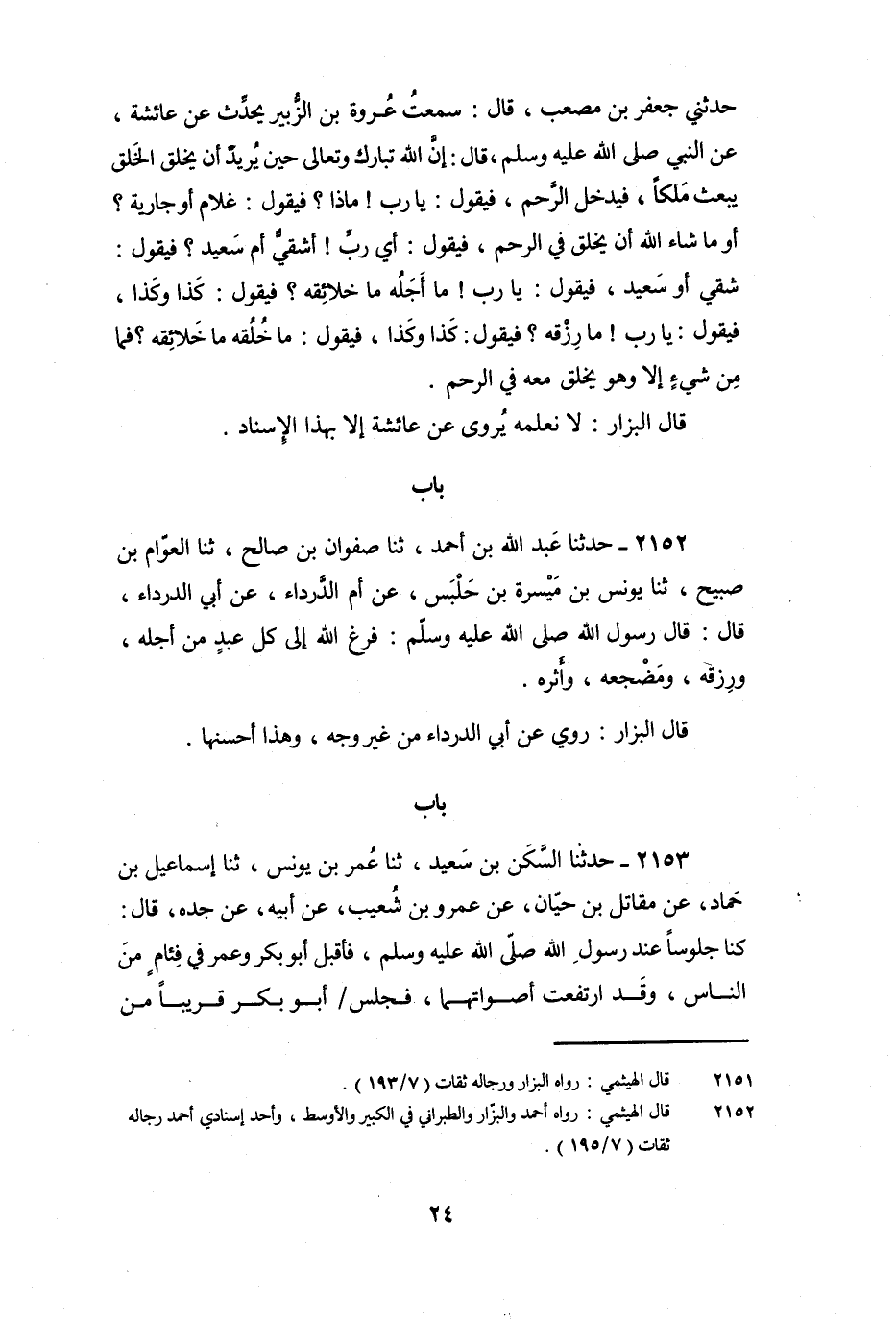 2152 - حَدَّثَنَا عَبْدُ اللَّهِ بْنُ أَحْمَدَ، ثنا صَفْوَانُ بْنُ صَالِحٍ، ثنا الْعَوَّامُ بْنُ صُبَيْحٍ، ثنا يُونُسُ بْنُ مَيْسَرَةَ بْنِ حَلْبَسٍ، عَنْ أُمِّ الدَّرْدَاءِ، عَنْ أَبِي الدَّرْدَاءِ، قَالَ: قَالَ رَسُولُ اللَّهِ صَلَّى اللَّهُ عَلَيْهِ وَسَلَّمَ: «فَرَغَ اللَّهُ إِلَى كُلِّ عَبْدٍ مِنْ أَجَلِهِ، وَرِزْقِهِ، وَمَضْجَعِهِ، وَأَثَرِهِ» .