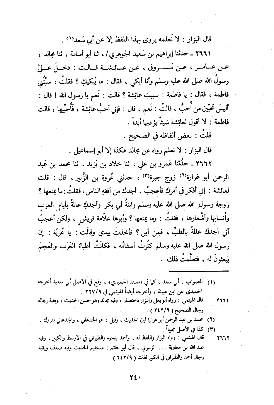 2661 - حَدَّثَنَا إِبْرَاهِيمُ بْنُ سَعِيدٍ الْجَوْهَرِيُّ، ثنا أَبُو أُسَامَةَ، ثنا مُجَالِدٌ، عَنْ عَامِرٍ، عَنْ مَسْرُوقٍ، عَنْ عَائِشَةَ قَالَتْ: دَخَلَ عَلَيَّ رَسُولُ اللَّهِ صَلَّى اللَّهُ عَلَيْهِ وَسَلَّمَ وَأَنَا أَبْكِي، فَقَالَ: «مَا يُبْكِيكِ؟» فَقُلْتُ، سَبَّتْنِي فَاطِمَةُ، فَقَالَ: " يَا فَاطِمَةُ: سَبَبْتِ عَائِشَةَ؟ " قَالَتْ: نَعَمْ يَا رَسُولَ اللَّهِ! قَالَ: «أَلَيْسَ تُحِبِّينَ مَنْ أُحِبُّ» قَالَتْ: نَعَمْ، قَالَ: «فَإِنِّي أُحِبُّ عَائِشَةَ، فَأَحِبِّيهَا» قَالَتْ فَاطِمَةُ: لا أَقُولُ لِعَائِشَةَ شَيْئًا يُؤْذِيهَا أَبَدًا.