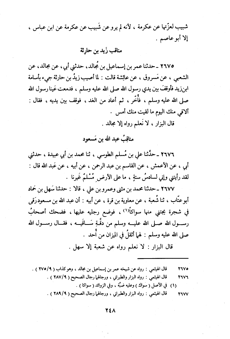 2675 - حَدَّثَنَا عُمَرُ بْنُ إِسْمَاعِيلَ بْنِ مُجَالِدٍ، حَدَّثَنِي أَبِي، عَنْ مُجَالِدٍ، عَنِ الشَّعْبِيِّ، عَنْ مَسْرُوقٍ، عَنْ عَائِشَةَ قَالَتْ: لَمَّا أُصِيبَ زَيْدُ بْنُ حَارِثَةَ جِيءَ بِأُسَامَةَ بْنِ زَيْدٍ فَأُوقِفَ بَيْنَ يَدَيْ رَسُولِ اللَّهِ صَلَّى اللَّهُ عَلَيْهِ وَسَلَّمَ، فَدَمِعَتْ عَيْنَا رَسُولِ اللَّهِ صَلَّى اللَّهُ عَلَيْهِ وَسَلَّمَ، فَأُخِّرَ، ثُمَّ أَعَادَ مِنَ الْغَدِ، فَوَقَفَ بَيْنَ يَدَيْهِ، فَقَالَ: أُلاقِي مِنْكَ الْيَوْمَ مَا لَقِيتُ مِنْكَ أَمْسُ.