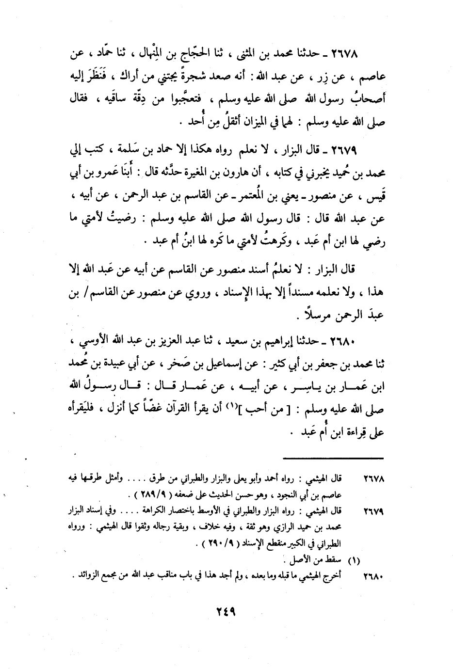 2678 - حَدَّثَنَا مُحَمَّدُ بْنُ الْمُثَنَّى، ثنا الْحَجَّاجُ بْنُ الْمِنْهَالِ، ثنا حَمَّادٌ، عَنْ عَاصِمٍ، عَنْ زِرٍّ، عَنْ عَبْدِ اللَّهِ: أَنَّهُ صَعِدَ شَجَرَةً يَجْتَنِي مِنْ أَرَاكٍ، فَنَظَرَ إِلَيْهِ أَصْحَابُ رَسُولِ اللَّهِ صَلَّى اللَّهُ عَلَيْهِ وَسَلَّمَ، فَتَعَجَّبُوا مِنْ دِقَّةِ سَاقَيْهِ، فَقَالَ صَلَّى اللَّهُ عَلَيْهِ وَسَلَّمَ: «لَهُمَا فِي الْمِيزَانِ أَثْقَلُ مِنْ أُحُدٍ» .