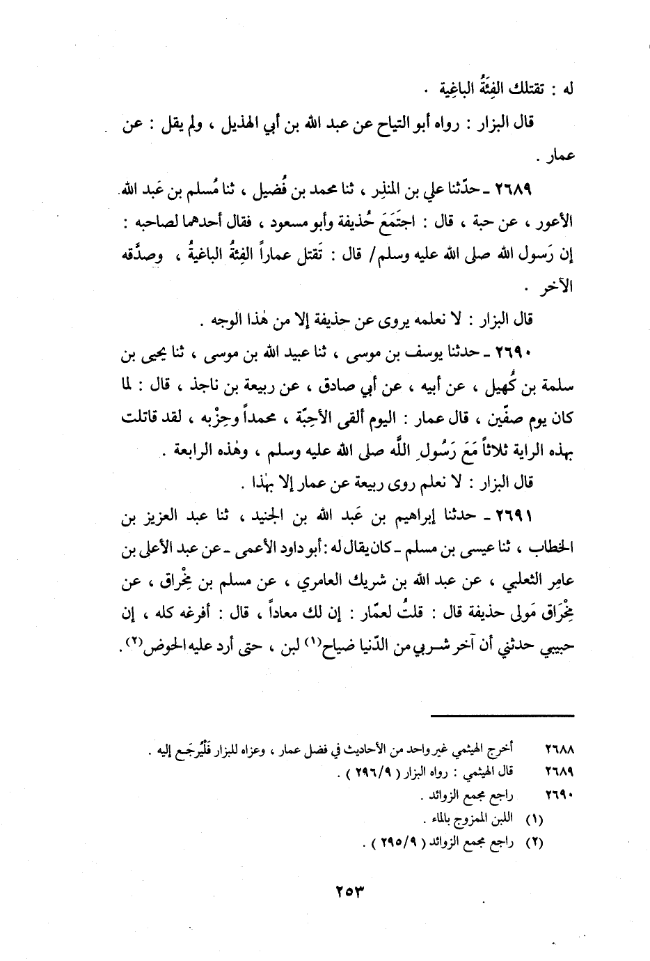 2689 - حَدَّثَنَا عَلِيُّ بْنُ الْمُنْذِرِ، ثنا مُحَمَّدُ بْنُ فُضَيْلٍ، ثنا مُسْلِمُ بْنُ عَبْدِ اللَّهِ الأَعْوَرُ، عَنْ حَبَّةَ، قَالَ: اجْتَمَعَ حَذَيْفَةُ وَأَبُو مَسْعُودٍ، فَقَالَ أَحَدُهُمَا لِصَاحِبِهِ: إِنَّ رَسُولَ اللَّهِ صَلَّى اللَّهُ عَلَيْهِ وَسَلَّمَ قَالَ: «تَقْتُلُ عَمَّارًا الْفِئَةَ الْبَاغِيَةَ» وَصَدَّقَهُ الآخَرُ.