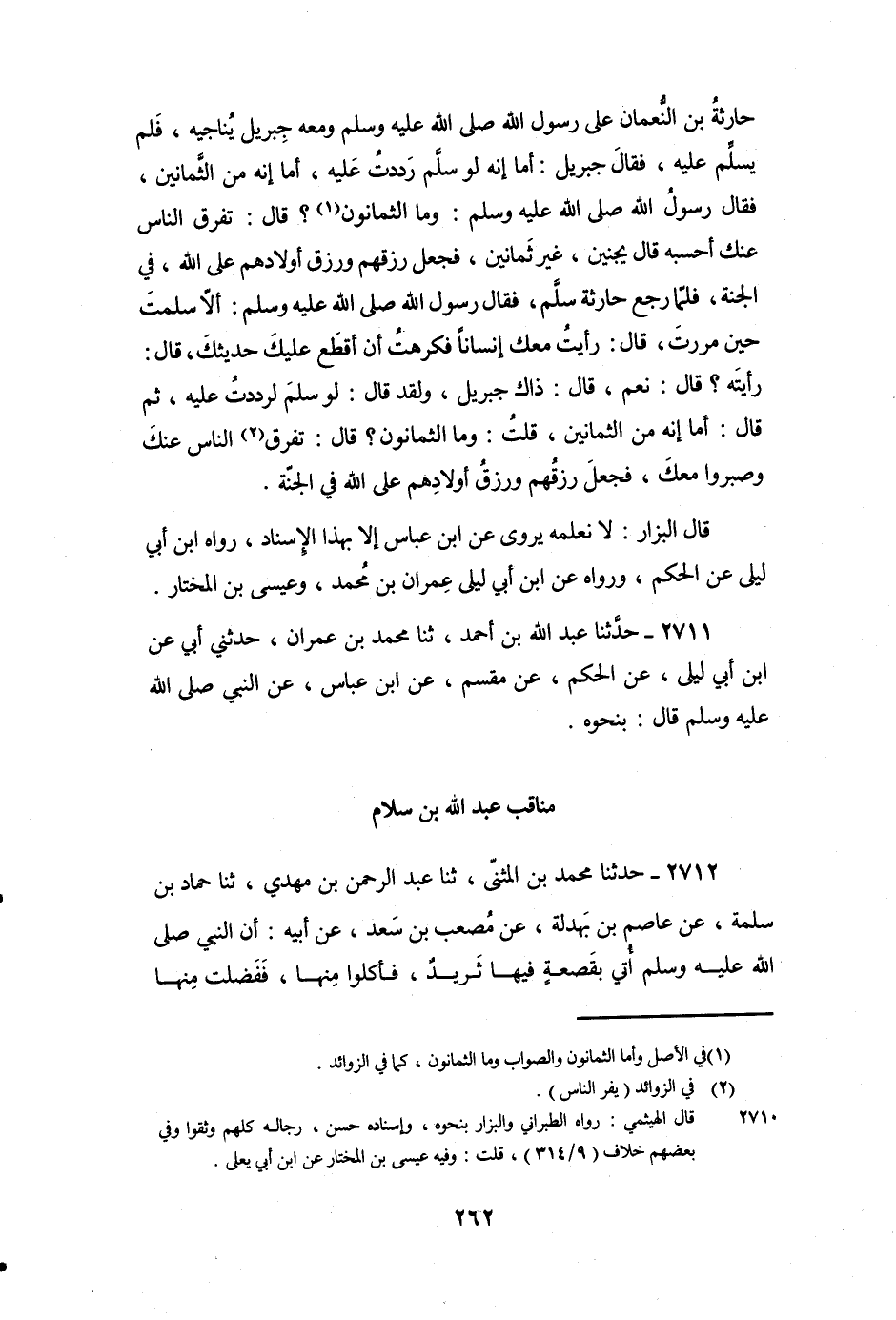 حَارِثَةُ بْنُ النُّعْمَانِ عَلَى رَسُولِ اللَّهِ صَلَّى اللَّهُ عَلَيْهِ وَسَلَّمَ وَمَعَهُ جِبْرِيلُ يُنَاجِيهِ، فَلَمْ يُسَلِّمْ عَلَيْهِ، فَقَالَ جِبْرِيلُ: أَمَا إِنَّهُ لَوْ سَلَّمَ رَدَدْتُ عَلَيْهِ، أَمَا إِنَّهُ مِنَ الثَّمَانِينَ، فَقَالَ رَسُولُ اللَّهِ صَلَّى اللَّهُ عَلَيْهِ وَسَلَّمَ: «وَمَا الثَّمَانُونَ؟» قَالَ: تَفَرَّقَ النَّاسُ عَنْكَ , أَحْسِبُهُ قَالَ: يجنين، غَيْرَ ثَمَانِينَ، فَجَعَلَ رِزْقَهُمْ وَرِزْقَ أَوْلادِهِمْ عَلَى اللَّهِ، فِي الْجَنَّةِ، فَلَمَّا رَجَعَ حَارِثَةُ سَلَّمَ، فَقَالَ رَسُولُ اللَّهِ صَلَّى اللَّهُ عَلَيْهِ وَسَلَّمَ: «أَلا سَلَّمْتَ حِينَ مَرَرْتَ» قَالَ: رَأَيْتُ مَعَكَ إِنْسَانًا فَكَرِهْتُ أَنْ أَقْطَعَ عَلَيْكَ حَدِيثَكَ، قَالَ: «رَأَيْتَهُ؟» قَالَ: نَعَمْ، قَالَ: " ذَاكَ جِبْرِيلُ، وَلَقَدْ قَالَ: لَوْ سَلَّمَ لَرَدَدْتُ عَلَيْهِ، ثُمَّ قَالَ: أَمَا إِنَّهُ مِنَ الثَّمَانِينَ، قُلْتُ: وَمَا الثَّمَانُونَ؟ قَالَ: تَفَرَّقَ النَّاسُ عَنْكَ وَصَبَرُوا مَعَكَ، فَجَعَلَ رِزْقَهُمْ وَرِزْقَ أَوْلادِهِمْ عَلَى اللَّهِ فِي الْجَنَّةِ ".