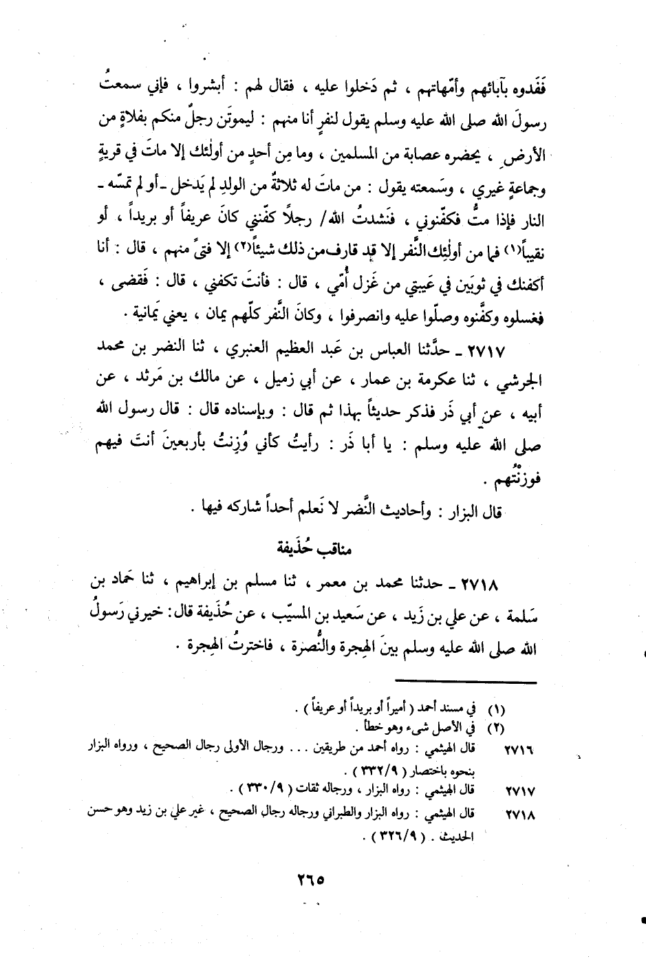 2718 - حَدَّثَنَا مُحَمَّدُ بْنُ مَعْمَرٍ، ثنا مُسْلِمُ بْنُ إِبْرَاهِيمَ، ثنا حَمَّادُ بْنُ سَلَمَةَ، عَنْ عَلِيِّ بْنِ زَيْدٍ، عَنْ سَعِيدِ بْنِ الْمُسَيِّبِ، عَنْ حُذَيْفَةَ قَالَ: خَيَّرَنِي رَسُول اللَّهِ صَلَّى اللَّهُ عَلَيْهِ وَسَلَّمَ بَيْنَ الْهِجْرَةِ وَالنُّصْرَةِ، فَاخْتَرْتُ الْهِجْرَةَ.