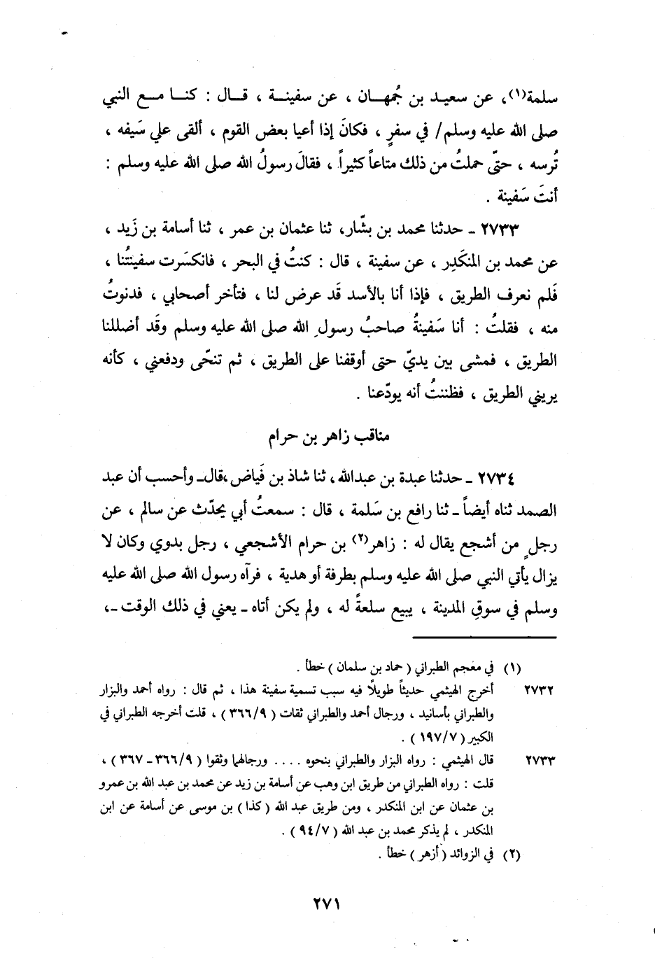 2733 - حَدَّثَنَا مُحَمَّدُ بْنُ بَشَّارٍ، ثنا عُثْمَانُ بْنُ عُمَرَ، ثنا أُسَامَةُ بْنُ زَيْدٍ، عَنْ مُحَمَّدِ بْنِ الْمُنْكَدِرِ، عَنْ سَفِينَةَ، قَالَ: كُنْتُ فِي الْبَحْرِ، فَانْكَسَرَتْ سَفِينَتُنَا، فَلَمْ نَعْرِفِ الطَّرِيقَ، فَإِذَا أَنَا بِالأَسَدِ قَدْ عَرَضَ لَنَا، فَتَأَخَّرَ أَصْحَابِي، فَدَنَوْتُ مِنْهُ، فَقُلْتُ: أَنَا سَفِينَةُ صَاحِبُ رَسُولِ اللَّهِ صَلَّى اللَّهُ عَلَيْهِ وَسَلَّمَ , وَقَدْ أَضْلَلْنَا الطَّرِيقَ، فَمَشَى بَيْنَ يَدِيَّ حَتَّى أَوْقَفَنَا عَلَى الطَّرِيقِ، ثُمَّ تَنَحَّى وَدَفَعَنِي، كَأَنَّهُ يُرِينِي الطَّرِيقَ، فَظَنَنْتُ أَنَّهُ يُوَدِّعُنَا.