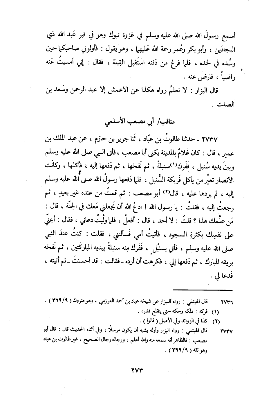 2737 - حَدَّثَنَا طَالُوتُ بْنُ عَبَّادٍ، ثنا جَرِيرُ بْنُ حَازِمٍ، عَنْ عَبْدِ الْمَلِكِ بْنِ عُمَيْرٍ، قَالَ: كَانَ غُلامٌ بِالْمَدِينَةِ يُكْنَى أَبَا مُصْعَبٍ، فَأَتَى النَّبِيَّ صَلَّى اللَّهُ عَلَيْهِ وَسَلَّمَ وَبَيْنَ يَدَيْهِ سُنْبُلٍ، فَفَرَكَ سُنْبُلَةً، ثُمَّ نَفَخَهَا، ثُمَّ دَفَعَهَا إِلَيْهِ، فَأَكَلَهَا، وَكَانَتِ الأَنْصَارُ تُعَيِّرُ مَنْ يَأْكُلُ فَرِيكَةَ السُّنْبُلِ، فَلَمَّا دَفَعَهَا رَسُولُ اللَّهِ صَلَّى اللَّهُ عَلَيْهِ وَسَلَّمَ إِلَيْهِ، لَمْ يَرُدَّهَا عَلَيْهِ، قَالَ أَبُو مُصْعَبٍ: ثُمَّ قُمْتُ مِنْ عِنْدَهُ غَيْرَ بَعِيدٍ، ثُمَّ رَجَعْتُ إِلَيْهِ، فَقُلْتُ: يَا رَسُولَ اللَّهِ! ادْعُ اللَّهَ أَنْ يَجْعَلَنِي مَعَكَ فِي الْجَنَّةِ، قَالَ: «مَنْ عَلَّمَكَ هَذَا؟» قُلْتُ: لا أَحَدَ، قَالَ: «أَفْعَلُ» فَلَمَّا وَلَيْتُ دَعَانِي، فَقَالَ: «أَعِنِّي عَلَى نَفْسِكَ بِكَثْرَةِ السُّجُودِ» فَأَتَيْتُ أُمِّي فَسَأَلَتْنِي، فَقُلْتُ: كُنْتُ عِنْدَ النَّبِيِّ صَلَّى اللَّهُ عَلَيْهِ وَسَلَّمَ، فَأُتِيَ بِسُنْبُلٍ، فَفَرَكَ مِنْهُ سُنْبُلَةً بِيَدَيْهِ الْمُبَارَكَتَيْنِ، ثُمَّ نَفَخَهُ بِرِيقِهِ الْمُبَارَكِ، ثُمَّ دَفَعَهَا إِلَيَّ، فَكَرِهْتُ أَنْ أَرُدَّهُ - فَقَالَتْ: قَدْ أَحْسَنْتَ - ثُمَّ أَتَيْتُهُ، فَدَعَا لي.