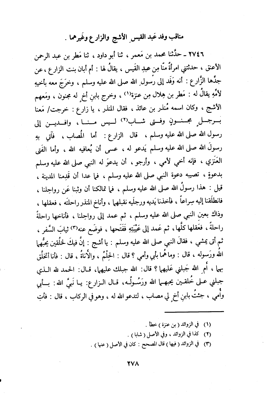2746 - حَدَّثَنَا مُحَمَّدُ بْنُ مَعْمَرٍ، ثنا أَبُو دَاوُدَ، ثنا مَطَرُ بْنُ عَبْدِ الرَّحْمَنِ الأَعْنَقُ، حَدَّثَتْنِي امْرَأَةٌ مِنَّا مِنْ عَبْدِ الْقَيْسِ، يُقَالُ لَهَا: أُمُّ أَبَانٍ بِنْتُ الزَّارِعِ، عَنْ جَدِّهَا الزَّارِعِ: أَنَّهُ وَفَدَ إِلَى رَسُولِ اللَّهِ صَلَّى اللَّهُ عَلَيْهِ وَسَلَّمَ، وَخَرَجَ مَعَهُ بِأَخِيهِ لأُمِّهِ يُقَالُ لَهُ: مَطَرُ بْنُ هِلالٍ مِنْ عَنْزَةَ، وَخَرَجَ بِابْنِ أَخٍ لَهُ مَجْنُونٍ، وَمَعَهُمُ الأَشَجُّ، وَكَانَ اسْمُهُ مُنْذِرُ بْنُ عَائِذٍ، فَقَالَ الْمُنْذِرِ، يَا زَارِعُ: خَرَجْتَ مَعَنَا بِرَجُلٍ مَجْنُونٍ وَفَتًى شَابٍّ لَيْسَ مِنَّا، وَافِدِينَ إِلَى رَسُولِ اللَّهِ صَلَّى اللَّهُ عَلَيْهِ وَسَلَّمَ، قَالَ الزَّارِعُ: أَمَّا الْمُصَابُ، فَآتِي بِهِ رَسُولَ اللَّهِ صَلَّى اللَّهُ عَلَيْهِ وَسَلَّمَ يَدْعُو لَهُ، عَسَى أَنْ يُعَافِيَهُ اللَّهُ، وَأَمَّا الْفَتَى الْعَنْزِيُّ، فَإِنَّهُ أَخِي لأُمِّي، وَأَرْجُو أَنْ يَدْعُوَ لَهُ النَّبِيُّ صَلَّى اللَّهُ عَلَيْهِ وَسَلَّمَ بِدَعْوَةٍ، تُصِيبُهُ دَعْوَةُ النَّبِيِّ صَلَّى اللَّهُ عَلَيْهِ وَسَلَّمَ، فَمَا عَدَا أَنْ قَدِمْنَا الْمَدِينَةَ، قِيلَ: هَذَا رَسُولُ اللَّهِ صَلَّى اللَّهُ عَلَيْهِ وَسَلَّمَ، فَمَا تَمَالَكْنَا أَنْ وَثَبْنَا عَنْ رَوَاحِلِنَا، فَانْطَلَقْنَا إِلَيْهِ سِرَاعًا، فَأَخَذْنَا يَدَيْهِ وَرِجْلَيْهِ نُقَبْلِهُمَا، وَأَنَاخَ الْمُنْذِرُ رَاحِلَتَهُ، فَعَقَلَهَا، وَذَاكَ بِعَيْنِ النَّبِيِّ صَلَّى اللَّهُ عَلَيْهِ وَسَلَّمَ، ثُمَّ عَمَدَ إِلَى رَوَاحِلِنَا، فَأَنَاخَهَا رَاحِلَةً رَاحِلَةً، فَعَقَلَهَا كُلَّهَا، ثُمَّ عَمَدَ إِلَى عَيْبَتِهِ فَفَتَحَهَا، فَوَضَعَ عَنْهُ ثِيَابَ السَّفَرِ، ثُمَّ أَتَى يَمْشِي، فَقَالَ النَّبِيُّ صَلَّى اللَّهُ عَلَيْهِ وَسَلَّمَ: " يَا أَشَجُّ: إِنَّ فِيكَ لَخُلُقَيْنِ يُحِبُّهُمَا اللَّهُ وَرَسُولُهُ " قَالَ: وَمَا هُمَا بِأَبِي وَأُمِّي؟ قَالَ: «الْحِلْمُ، وَالأَنَاةُ» قَالَ: فَأَنَا أَتَخَلَّقُ بِهِمَا، أَمِ اللَّهُ جَبَلَنِي عَلَيْهِمَا؟ قَالَ: «اللَّهُ جَبَلَكَ عَلَيْهِمَا» ، قَالَ: الْحَمْدُ لِلَّهِ الَّذِي جَبَلَنِي عَلَى خُلُقَيْنِ يُحِبُّهُمَا اللَّهُ وَرَسُولُهُ، قَالَ الزَّارِعُ: يَا نَبِيَّ اللَّهِ: بِأَبِي وَأُمِّي، جِئْتُ بِابْنِ أَخٍ لِي مُصَابٍ، لِتَدْعُوَ اللَّهَ لَهُ، وَهُوَ فِي الرِّكَابِ، قَالَ: «فَأْتِ