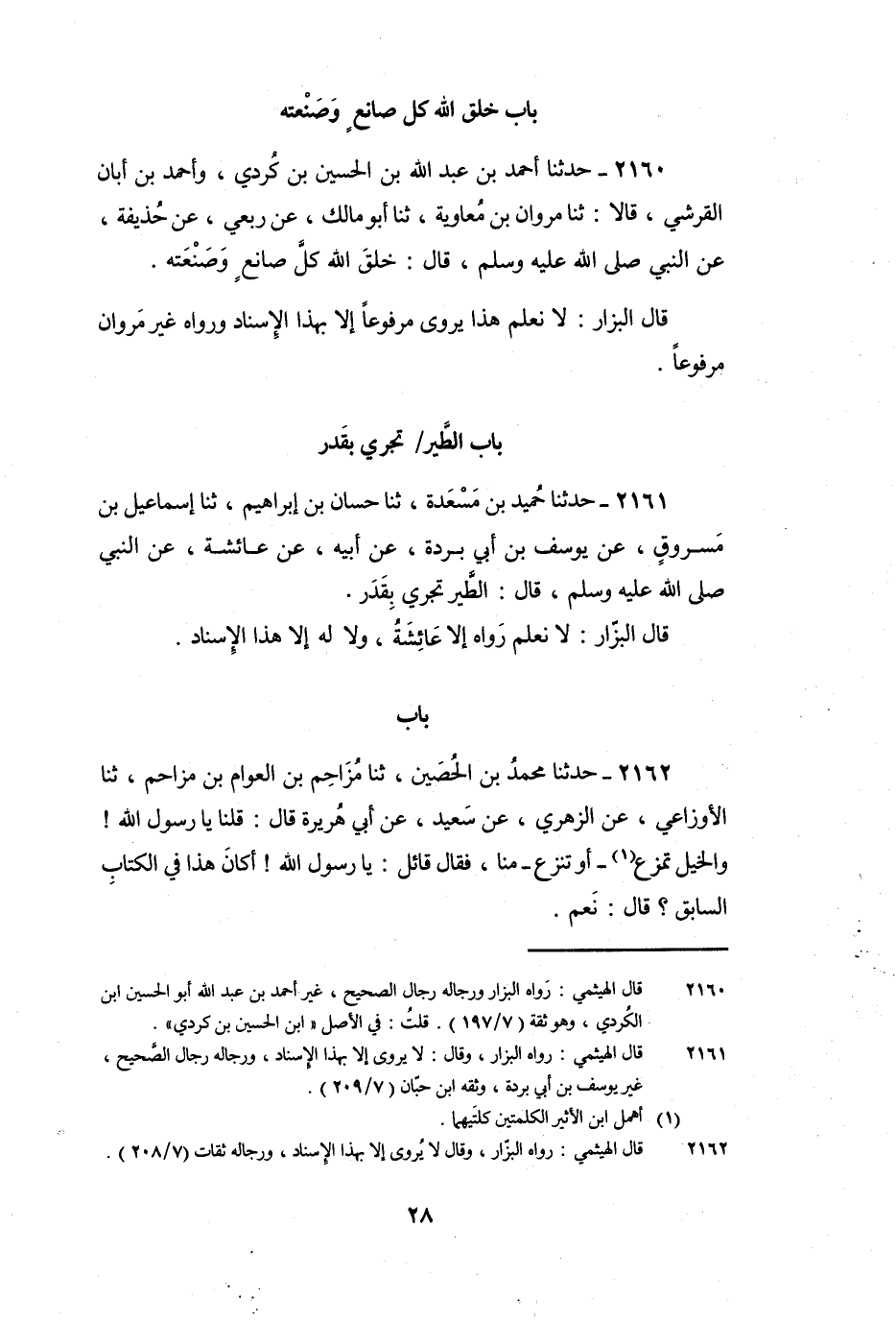 2161 - حَدَّثَنَا حُمَيْدُ بْنُ مَسْعَدَةَ، ثنا حَسَّانُ بْنُ إِبْرَاهِيمَ، ثنا إِسْمَاعِيلُ بْنُ مَسْرُوقٍ، عَنْ يُوسُفَ بْنِ أَبِي بُرْدَةَ، عَنْ أَبِيهِ، عَنْ عَائِشَةَ، عَنِ النَّبِيِّ صَلَّى اللَّهُ عَلَيْهِ وَسَلَّمَ، قَالَ: «الطَّيْرُ تَجْرِي بِقَدَرٍ» .