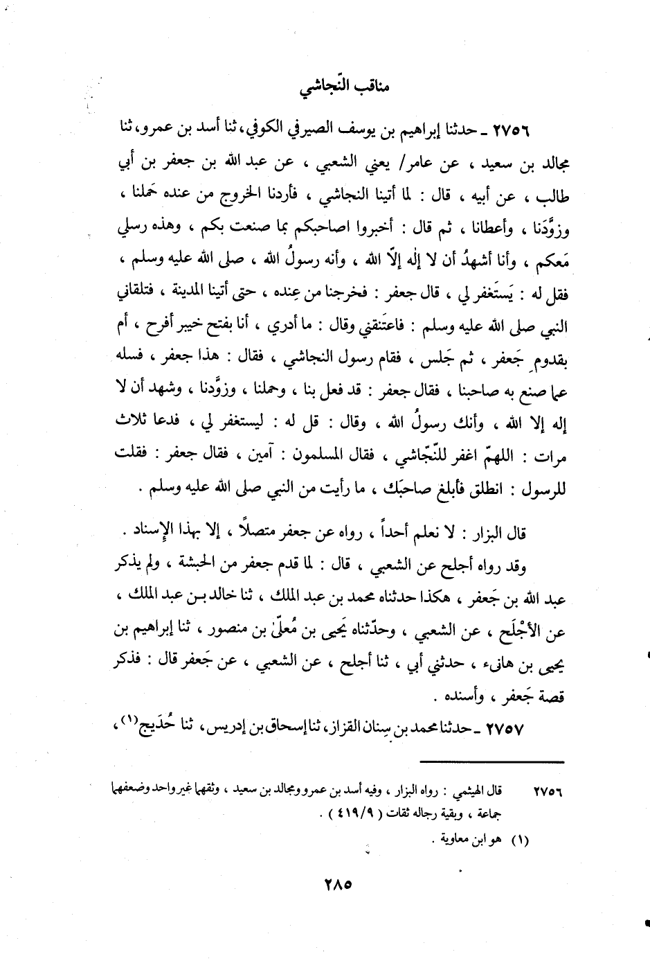 2756 - حَدَّثَنَا إِبْرَاهِيمُ بْنُ يُوسُف الصَّيْرَفِيُّ الْكُوفِيُّ، ثنا أَسَدُ بْنُ عَمْرٍو، ثنا مُجَالِدُ بْنُ سَعِيدٍ، عَنْ عَامِرٍ , يَعْنِي: الشَّعْبِيَّ، عَنْ عَبْدِ اللَّهِ بْنِ جَعْفَرِ بْنِ أَبِي طَالِبٍ، عَنْ أَبِيهِ، قَالَ: لَمَّا أَتَيْنَا النَّجَاشِيَّ، فَأَرَدْنَا الْخُرُوجَ مِنْ عِنْدِهِ حَمَّلَنَا، وَزَوَّدَنَا، وَأَعْطَانَا، ثُمَّ قَالَ: أَخْبِرُوا أَصَاحِبَكُمْ بِمَا صَنَعْتُ بِكُمْ، وَهَذِهِ رُسُلِي مَعَكُمْ، وَأَنَا أَشْهَدُ أَنْ لا إِلَهَ إِلا اللَّهُ، وَأَنَّهُ رَسُولُ اللَّهِ صَلَّى اللَّهُ عَلَيْهِ وَسَلَّمَ، فَقُلْ لَهُ يَسْتَغْفِرُ لِي، قَالَ جَعْفَرٌ: فَخَرَجْنَا مِنْ عِنْدِهِ، حَتَّى أَتَيْنَا الْمَدِينَةَ، فَتَلَقَّانِي النَّبِيُّ صَلَّى اللَّهُ عَلَيْهِ وَسَلَّمَ , فَاعْتَنَقَنِي وَقَالَ: مَا أَدْرِي، أَنَا بِفَتْحِ خَيْبَرَ أَفْرَحُ، أَمْ بِقُدُومِ جَعْفَرٍ " ثُمَّ جَلَسَ، فَقَامَ رَسُولُ النَّجَاشِيِّ، فَقَالَ: هَذَا جَعْفَرٌ، فَسَلْهُ عَمَّا صَنَعَ بِهِ صَاحِبُنَا، فَقَالَ جَعْفَرٌ: قَدْ فَعَلَ بِنَا، وَحَمَّلَنَا، وَزَوَّدَنَا، وَشَهِدَ أَنْ لا إِلَهَ إِلا اللَّهُ، وَأَنَّكَ رَسُولُ اللَّهِ، وَقَالَ: قُلْ لَهُ: لِيَسْتَغْفِرْ لِي، فَدَعَا ثَلاثَ مَرَّاتٍ: «اللَّهُمَّ اغْفِرْ لِلنَّجَاشِيِّ» فَقَالَ الْمُسْلِمُونَ: آمِينَ، فَقَالَ جَعْفَرٌ: فَقُلْتُ لِلرَّسُولِ: انْطَلِقْ فَأَبْلِغْ صَاحِبَكَ مَا رَأَيْتَ مِنَ النَّبِيِّ صَلَّى اللَّهُ عَلَيْهِ وَسَلَّمَ.