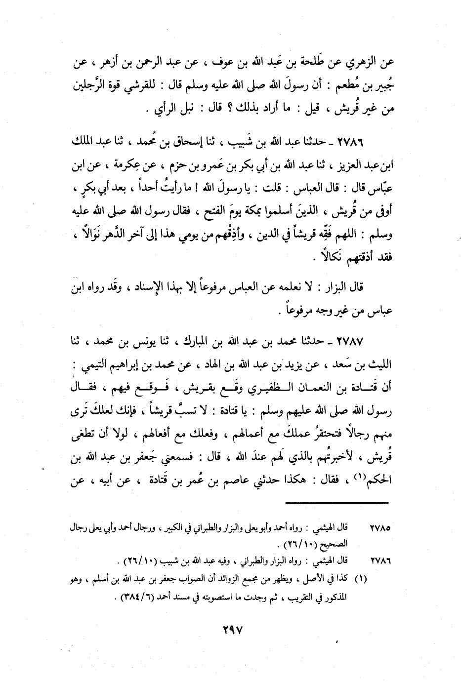 2786 - حَدَّثَنَا عَبْدُ اللَّهِ بْنُ شَبِيبٍ، ثنا إِسْحَاقُ بْنُ مُحَمَّدٍ، ثنا عَبْدُ الْمَلِكِ بْنُ عَبْدِ الْعَزِيزِ، ثنا عَبْدُ اللَّهِ بْنُ أَبِي بَكْرِ بْنِ عَمْرِو بْنِ حَزْمٍ، عَنْ عِكْرِمَةَ، عَنِ ابْنِ عَبَّاسٍ قَالَ: قَالَ الْعَبَّاسُ: قُلْتُ: يَا رَسُولَ اللَّهِ! مَا رَأَيْتُ أَحَدًا، بَعْدَ أَبِي بَكْرٍ أَوْفَى مِنْ قُرَيْشٍ الَّذِينَ أَسْلَمُوا بِمَكَّةَ يَوْمَ الْفَتْحِ، فَقَالَ رَسُولُ اللَّهِ صَلَّى اللَّهُ عَلَيْهِ وَسَلَّمَ: «اللَّهُمَّ فَقِّهْ قُرَيْشًا فِي الدِّينِ، وَأَذِقْهُمْ مِنْ يَوْمِي هَذَا إِلَى آخِرِ الدَّهْرِ نَوَالا، فَقَدْ أَذَقْتُهُمْ نَكَالا» .