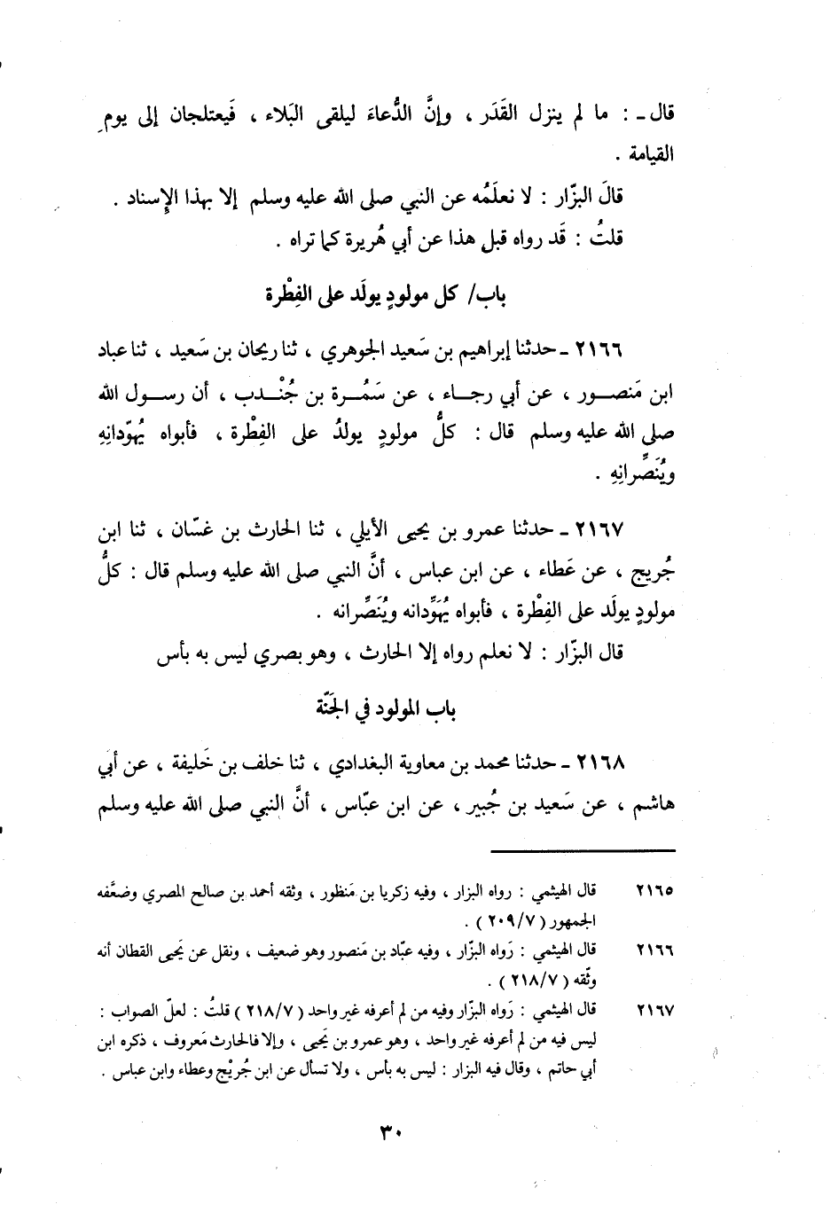 2166 - حَدَّثَنَا إِبْرَاهِيمُ بْنُ سَعِيدٍ الْجَوْهَرِيُّ، ثنا رَيْحَانُ بْنُ سَعِيدٍ، ثنا عَبَّادُ بْنُ مَنْصُورٍ، عَنْ أَبِي رَجَاءٍ، عَنْ سَمُرَةَ بْنِ جُنْدُبٍ، أَنَّ رَسُولَ اللَّهِ صَلَّى اللَّهُ عَلَيْهِ وَسَلَّمَ قَالَ: كُلُّ مَوْلُودٍ يُولَدُ عَلَى الْفِطْرَةِ، فَأَبَوَاهُ يُهَوِّدَانِهِ وَيُنَصِّرَانِهِ.