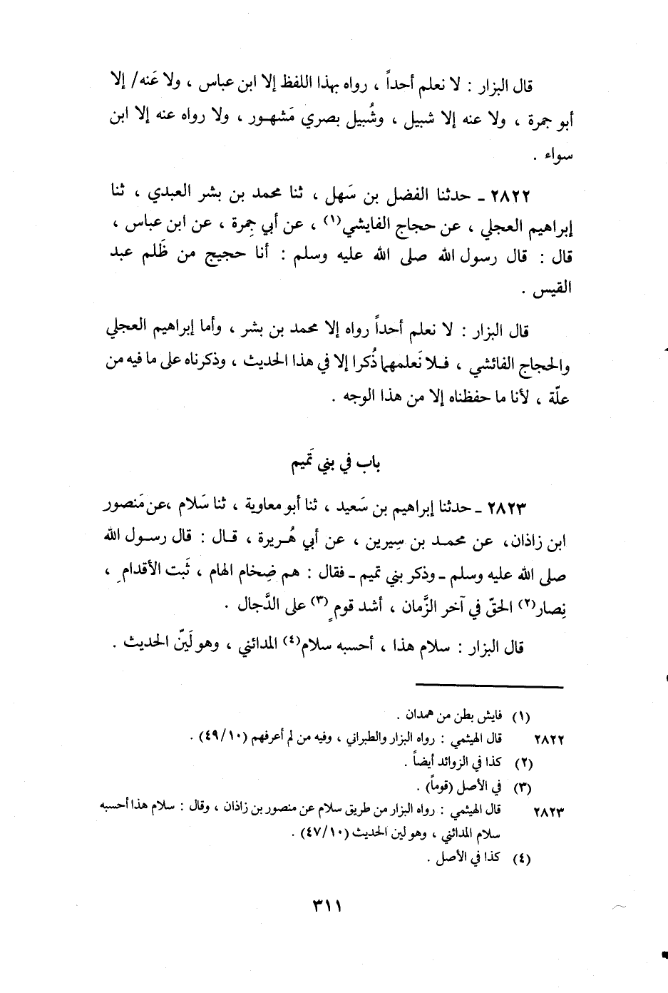2823 - حَدَّثَنَا إِبْرَاهِيمُ بْنُ سَعِيدٍ، ثنا أَبُو مُعَاوِيَةَ، ثنا سَلامٌ، عَنْ مَنْصُورِ بْنِ زَاذَانَ، عَنْ مُحَمَّدِ بْنِ سِيرِينَ، عَنْ أَبِي هُرَيْرَةَ، قَالَ: قَالَ رَسُولُ اللَّهِ صَلَّى اللَّهُ عَلَيْهِ وَسَلَّمَ - وَذَكَرَ بَنِي تَمِيمٍ - فَقَالَ: «هُمْ ضِخَامُ الْهَامِ، ثَبْتُ الأَقْدَامِ، نِصَارُ الْحَقِّ فِي آخِرِ الزَّمَانِ، أَشَدُّ قَوْمٍ عَلَى الدَّجَّالِ» .