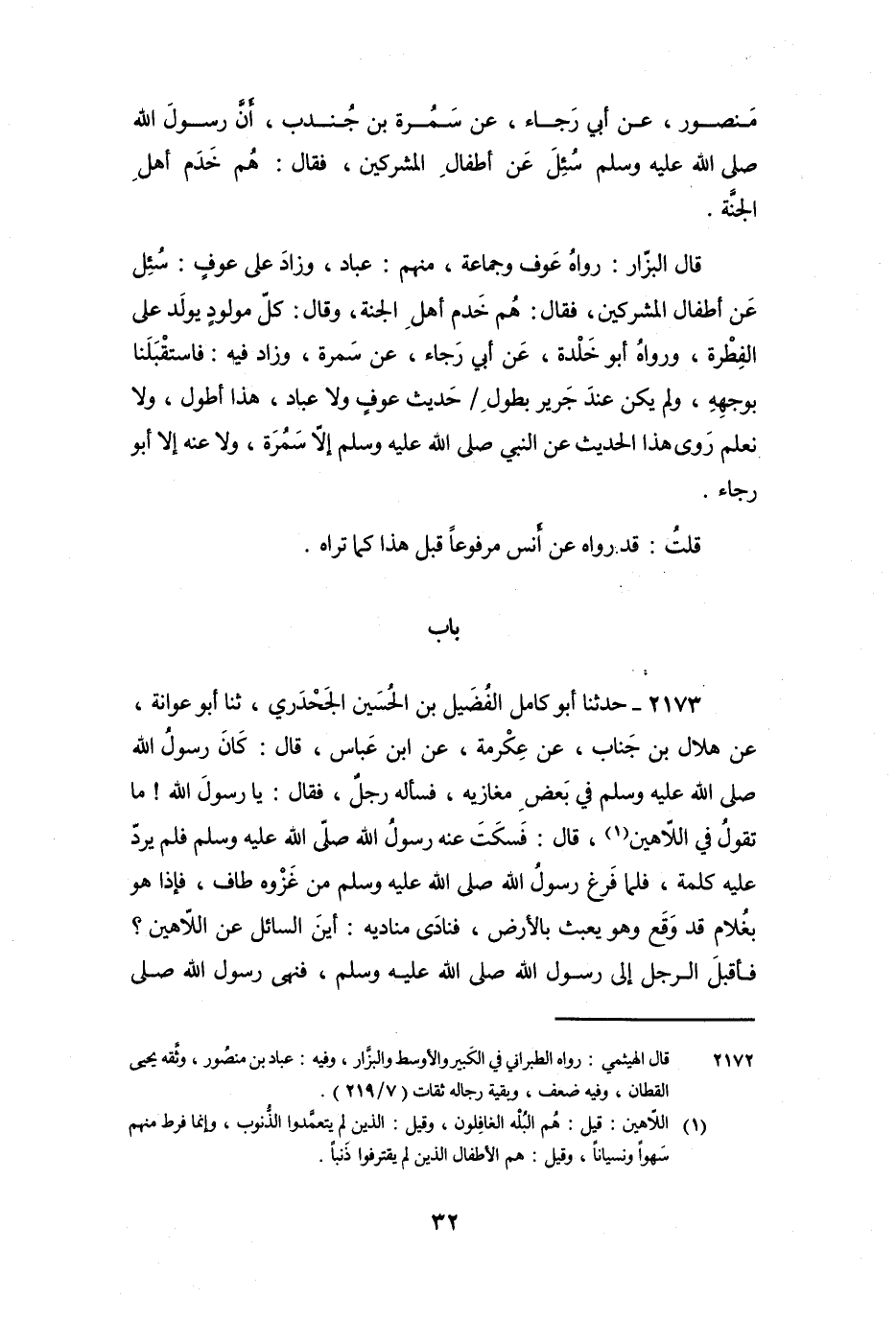 مَنْصُورٍ، عَنْ أَبِي رَجَاءٍ، عَنْ سَمُرَةَ بْنِ جُنْدُبٍ، أَنَّ رَسُولَ اللَّهِ صَلَّى اللَّهُ عَلَيْهِ وَسَلَّمَ سُئِلَ عَنْ أَطْفَالِ الْمُشْرِكِينَ، فَقَالَ: «هُمْ خَدَمُ أَهْلِ الْجَنَّةِ» .