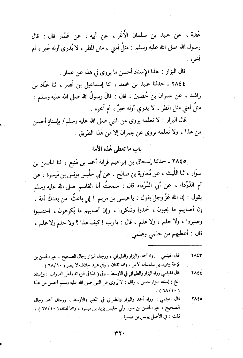 2844 - حَدَّثَنَا عُبَيْدُ بْنُ مُحَمَّدٍ، ثنا إِسْمَاعِيلُ بْنُ نَصْرٍ، ثنا عَبَّادُ بْنُ رَاشِدٍ، عَنْ عِمْرَانَ بْنِ حُصَيْنٍ، قَالَ: قَالَ رَسُولُ اللَّهِ صَلَّى اللَّهُ عَلَيْهِ وَسَلَّمَ: «مَثَلُ أُمَّتِي مَثَلُ الْمَطَرِ، لا يُدْرَى أَوَّلُهُ خَيْرٌ، أَمْ آخِرُهُ» .