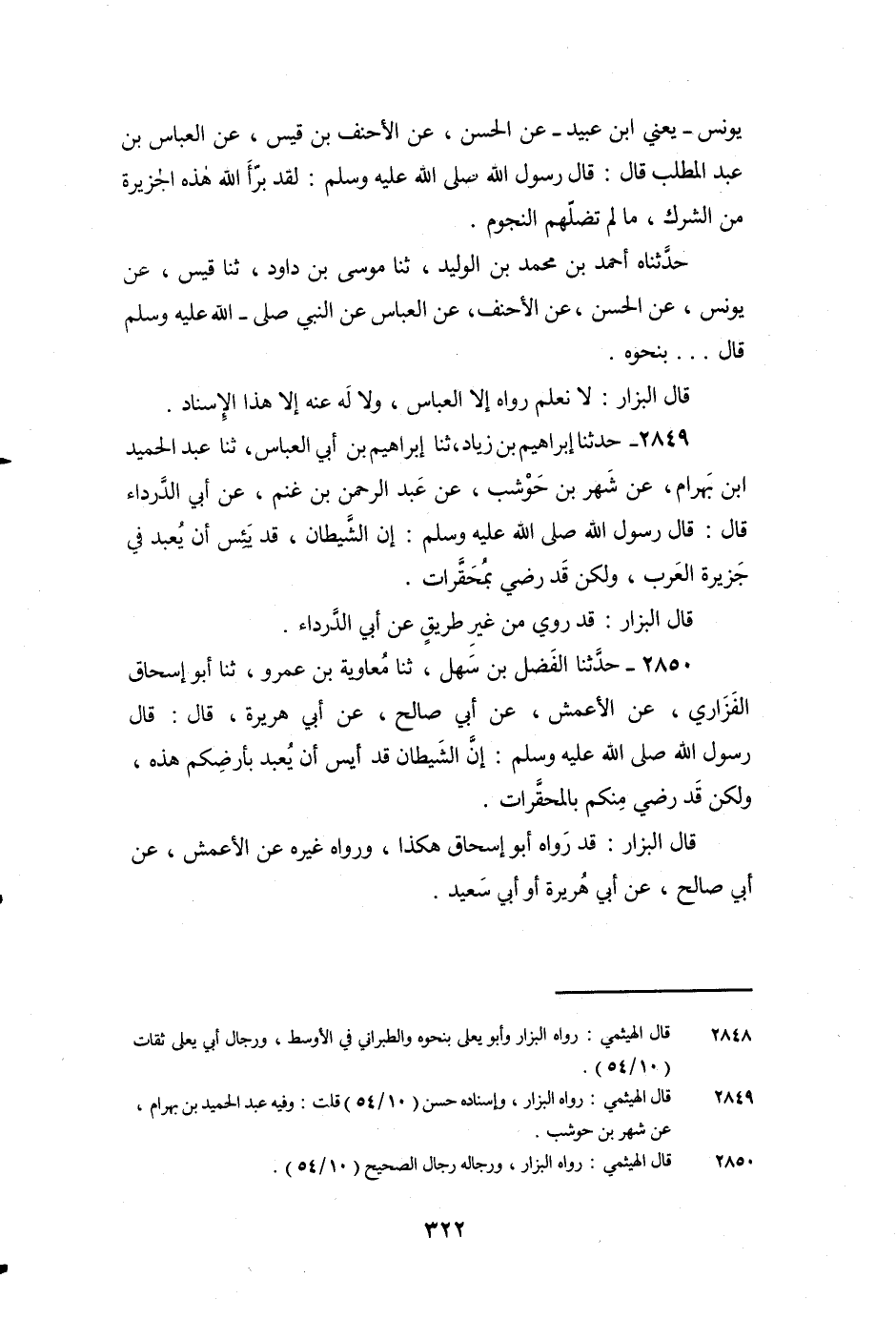 2849 - حَدَّثَنَا إِبْرَاهِيمُ بْنُ زِيَادٍ، ثنا إِبْرَاهِيمُ بْنُ أَبِي الْعَبَّاسِ، ثنا عَبْدُ الْحَمِيدِ بْنُ بَهْرَامَ، عَنْ شَهْرِ بْنِ حَوْشَبٍ، عَنْ عَبْدِ الرَّحْمَنِ بْنِ غَنْمٍ، عَنْ أَبِي الدَّرْدَاءِ قَالَ: قَالَ رَسُولُ اللَّهِ صَلَّى اللَّهُ عَلَيْهِ وَسَلَّمَ: «إِنَّ الشَّيْطَانَ قَدْ يَئِسَ أَنْ يُعْبَدَ فِي جَزِيرَةِ الْعَرَبِ، وَلَكِنْ قَدْ رَضِيَ بِمُحَقَّرَاتٍ» .