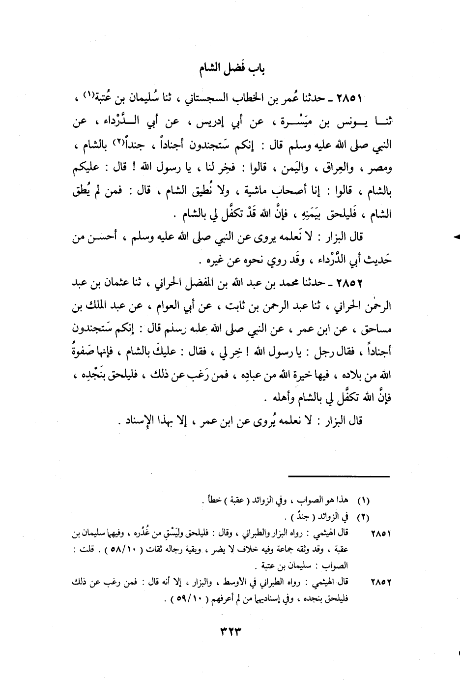 2851 - حَدَّثَنَا عُمَرُ بْنُ الْخَطَّابِ السِّجِسْتَانِيُّ، ثنا سُلَيْمَانُ بْنُ عُتْبَةَ، ثنا يُونُسُ بْنُ مَيْسَرَةَ، عَنْ أَبِي إِدْرِيسَ، عَنْ أَبِي الدَّرْدَاءِ، عَنِ النَّبِيِّ صَلَّى اللَّهُ عَلَيْهِ وَسَلَّمَ قَالَ: «إِنَّكُمْ سَتُجَنَّدُونَ أَجْنَادًا، جُنْدًا بِالشَّامِ، وَمِصْرَ، وَالْعِرَاقِ، وَالْيَمَنِ» قَالُوا: فَخِرْ لَنَا، يَا رَسُولَ اللَّهِ! قَالَ: «عَلَيْكُمْ بِالشَّامِ» قَالُوا: إِنَّا أَصْحَابُ مَاشِيَةٍ، وَلا نُطِيقُ الشَّامَ، قَالَ: «فَمَنْ لَمْ يُطِقِ الشَّامَ، فَلْيَلْحَقْ بِيَمَنِهِ، فَإِنَّ اللَّهَ قَدْ تَكَفَّلَ لِي بِالشَّامِ» .