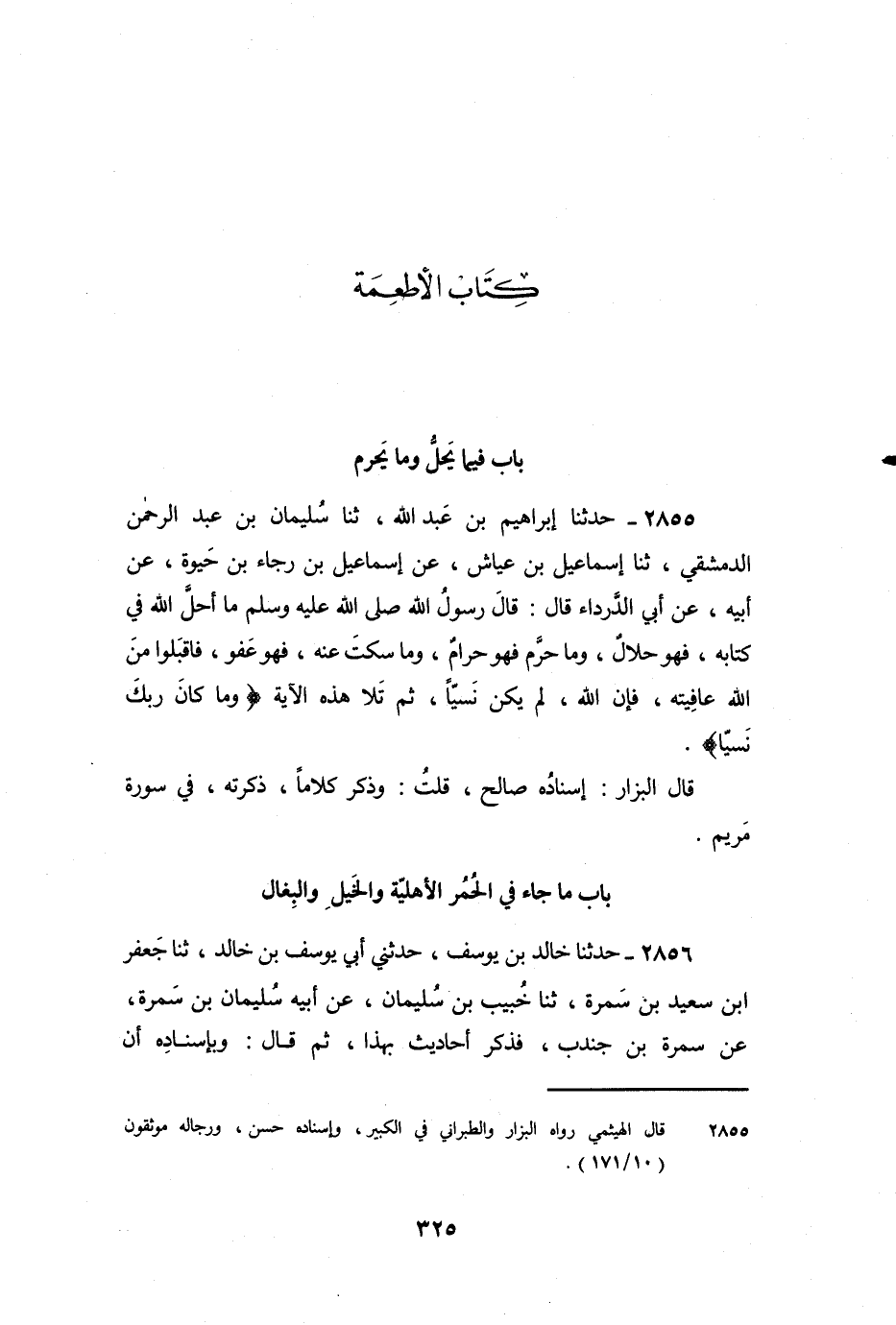 2855 - حَدَّثَنَا إِبْرَاهِيمُ بْنُ عَبْدِ اللَّهِ، ثنا سُلَيْمَانُ بْنُ عَبْدِ الرَّحْمَنِ الدِّمَشْقِيُّ، ثنا إِسْمَاعِيلُ بْنُ عَيَّاشٍ، عَنْ عَاصِمِ بْنِ رَجَاءِ بْنِ حَيْوَةَ، عَنْ أَبِيهِ، عَنْ أَبِي الدَّرْدَاءِ قَالَ: قَالَ رَسُولُ اللَّهِ صَلَّى اللَّهُ عَلَيْهِ وَسَلَّمَ: «مَا أَحَلَّ اللَّهُ فِي كِتَابِهِ، فَهُوَ حَلالٌ، وَمَا حَرَّمَ فَهُوَ حَرَامٌ، وَمَا سَكَتَ عَنْهُ، فَهُوَ عَفْوٌ، فَاقْبَلُوا مِنَ اللَّهِ عَافِيَتَهُ، فَإِنَّ اللَّهَ، لَمْ يَكُنْ نَسِيًّا» ثُمَّ تَلا هَذِهِ الآيَةَ {وَمَا كَانَ رَبُّكَ نَسِيًّا} [مريم: 64] .