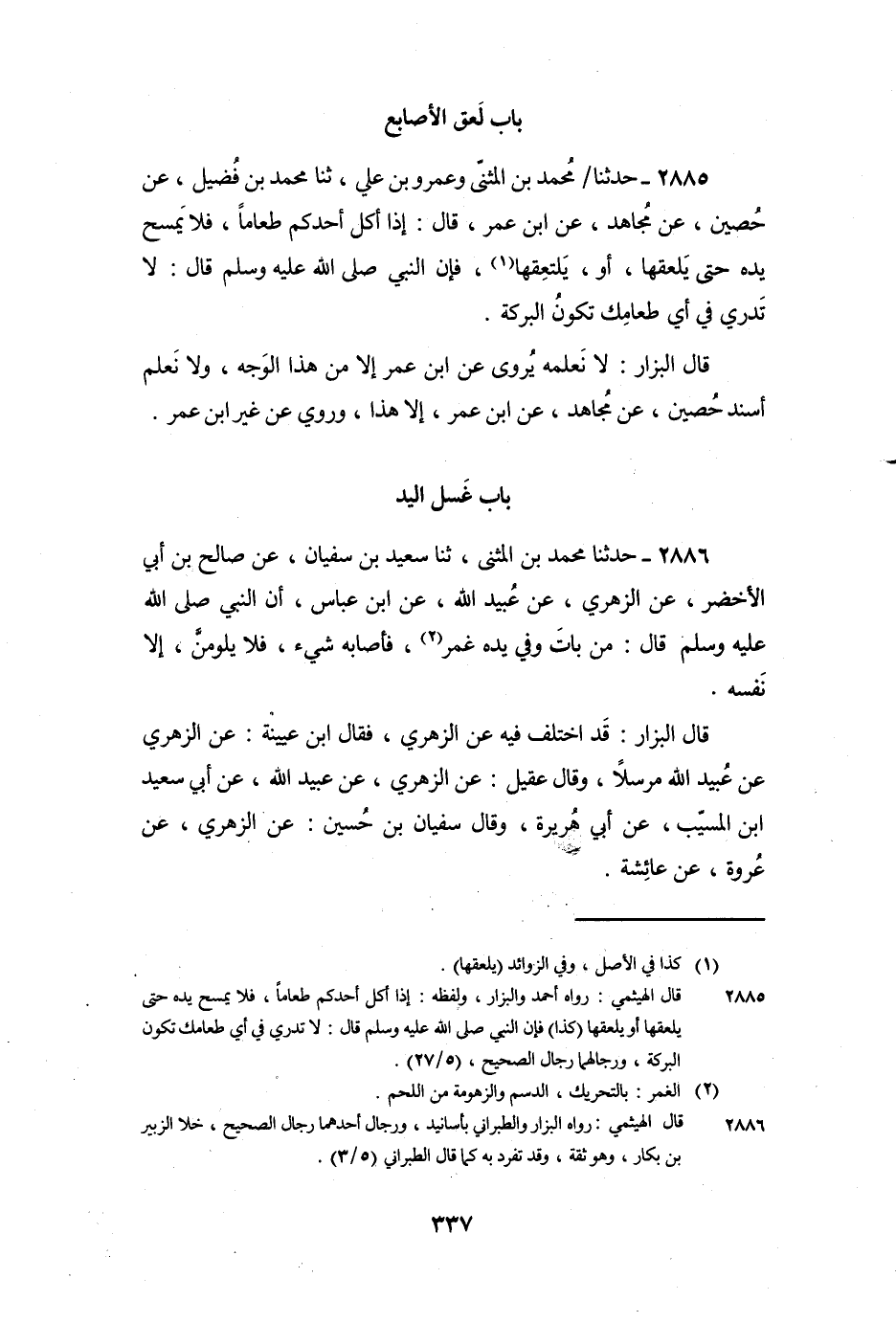2885 - حَدَّثَنَا مُحَمَّدُ بْنُ الْمُثَنَّى، وَعَمْرُو بْنُ عَلِيٍّ، ثنا مُحَمَّدُ بْنُ فُضَيْلٍ، عَنْ حُصَيْنٍ، عَنْ مُجَاهِدٍ، عَنِ ابْنِ عُمَرَ، قَالَ: إِذَا أَكَلَ أَحَدُكُمْ طَعَامًا، فَلا يَمْسَحْ يَدَهُ حَتَّى يَلْعَقَهَا، أَوْ، يَلْتَعِقَهَا، فَإِنَّ النَّبِيَّ صَلَّى اللَّهُ عَلَيْهِ وَسَلَّمَ قَالَ: «لا تَدْرِي فِي أَيِّ طَعَامِكَ تَكُونُ الْبَرَكَةُ» .