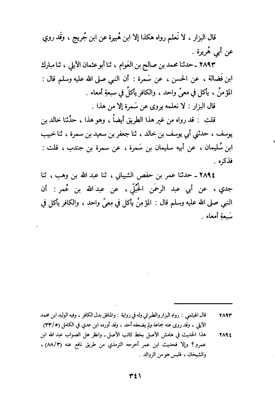 2893 - حَدَّثَنَا مُحَمَّدُ بْنُ صَالِحِ بْنِ الْعَوَّامِ، ثنا أَبُو عُثْمَانَ الأَيْلِيُّ، ثنا مُبَارَكُ بْنُ فَضَالَةَ، عَنِ الْحَسَنِ، عَنْ سَمُرَةَ: أَنَّ النَّبِيَّ صَلَّى اللَّهُ عَلَيْهِ وَسَلَّمَ قَالَ: «الْمُؤْمِنُ يَأْكُلُ فِي مِعًى وَاحِدٌ، وَالْكَافِرُ يَأْكُلُ فِي سَبْعَةِ أَمْعَاءٍ» .