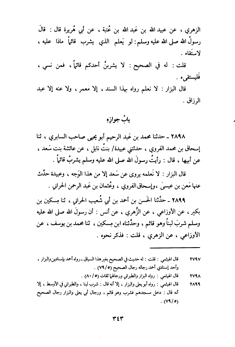 2898 - حَدَّثَنَا مُحَمَّدُ بْنُ عَبْدِ الرَّحِيمِ أَبُو يَحْيَى صَاحِبُ السَّابِرِيِّ، ثنا إِسْحَاقُ بْنُ مُحَمَّدٍ الْفَرْوِيُّ، حَدَّثَتْنِي عُبَيْدَةُ بِنْتُ نَابِلٍ، عَنْ عَائِشَةَ بِنْتِ سَعْدٍ، عَنْ أَبِيهَا، قَالَ: رَأَيْتُ رَسُولَ اللَّهِ صَلَّى اللَّهُ عَلَيْهِ وَسَلَّمَ يَشْرَبُ قَائِمًا.