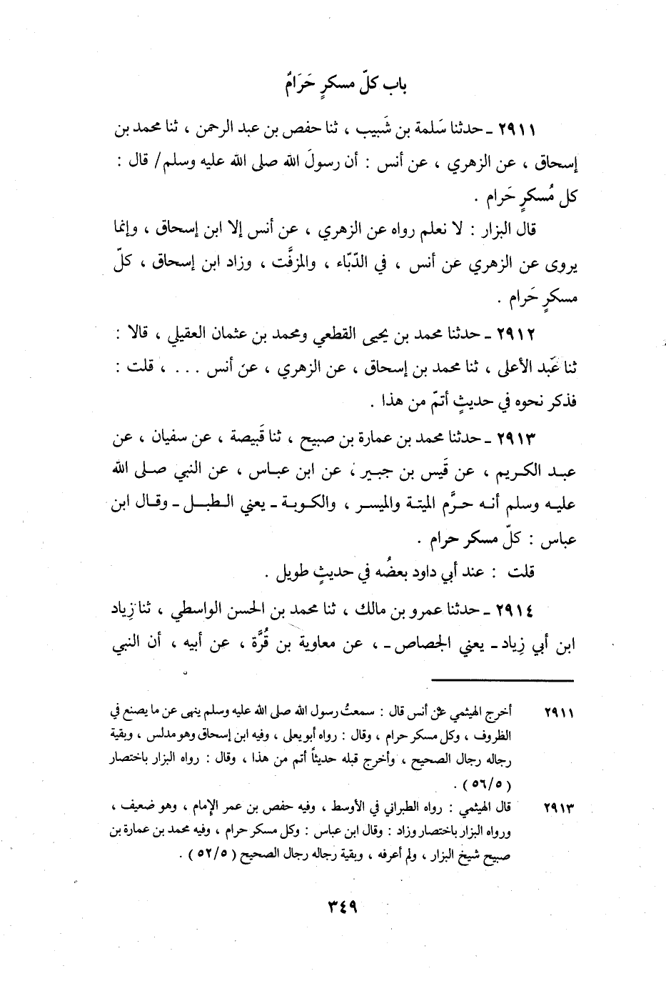 2911 - حَدَّثَنَا سَلَمَةُ بْنُ شَبِيبٍ، ثنا حَفْصُ بْنُ عَبْدِ الرَّحْمَنِ، ثنا مُحَمَّدُ بْنُ إِسْحَاقَ، عَنِ الزُّهْرِيِّ، عَنْ أَنَسٍ: أَنَّ رَسُولَ اللَّهِ صَلَّى اللَّهُ عَلَيْهِ وَسَلَّمَ قَالَ: «كُلُّ مُسْكِرٍ حَرَامٌ» .