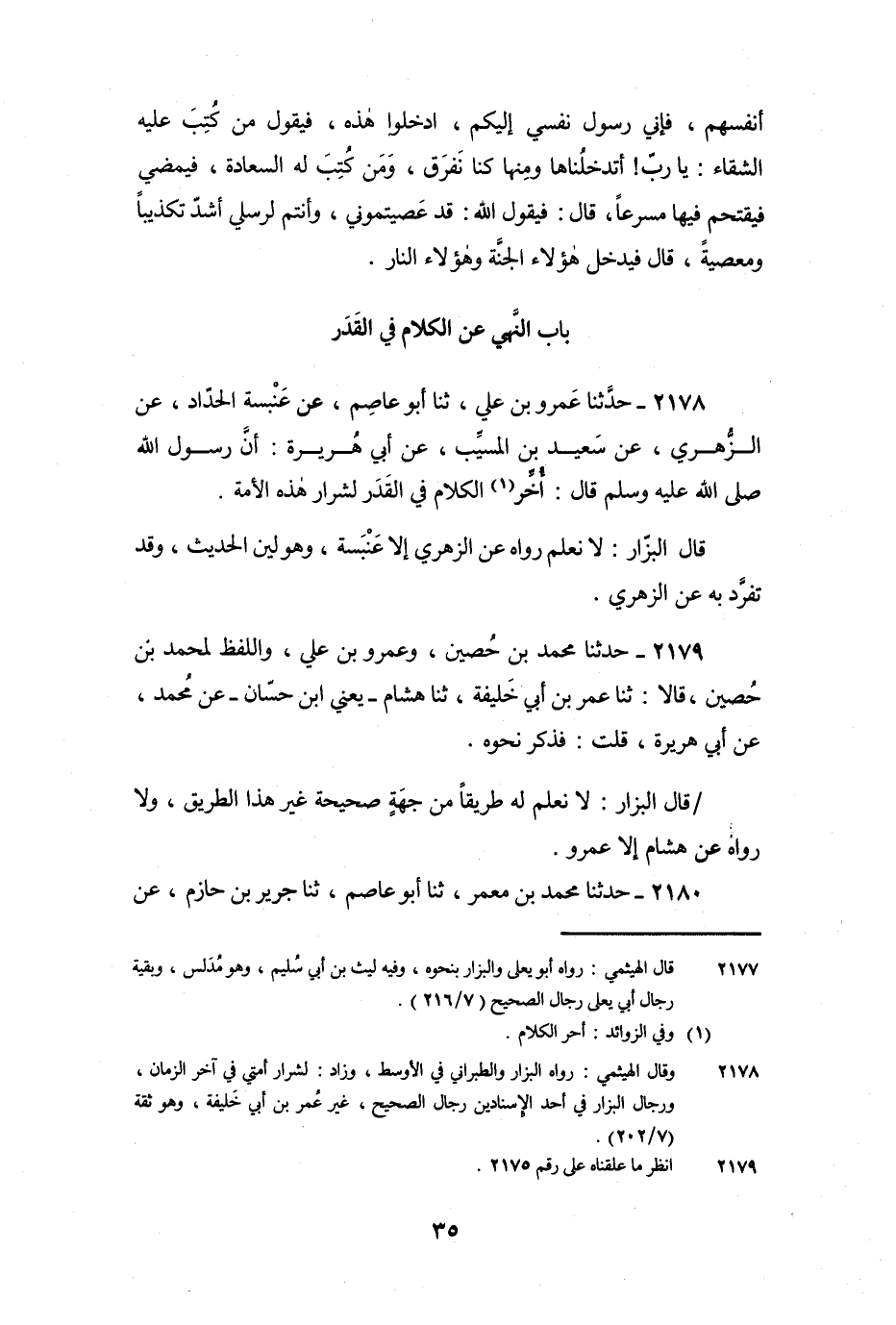 2178 - حَدَّثَنَا عَمْرُو بْنُ عَلِيٍّ، ثنا أَبُو عَاصِمٍ، عَنْ عَنْبَسَةَ الْحَدَّادِ، عَنِ الزُّهْرِيِّ، عَنْ سَعِيدِ بْنِ الْمُسَيِّبِ، عَنْ أَبِي هُرَيْرَةَ: أَنَّ رَسُولَ اللَّهِ صَلَّى اللَّهُ عَلَيْهِ وَسَلَّمَ قَالَ: «أُخِّرَ الْكَلامُ فِي الْقَدَرِ لِشِرَارِ هَذِهِ الأُمَّةِ» .