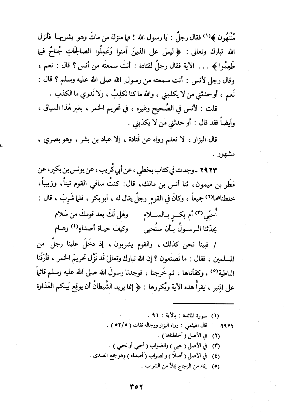 مُنْتَهُونَ} [المائدة: 91] " فَقَالَ رَجُلٌ: يَا رَسُولَ اللَّهِ! فَمَا مَنْزِلَةُ مَنْ مَاتَ وَهُوَ يَشْرَبُهَا فَأَنْزَلَ اللَّهُ تَبَارَكَ وَتَعَالَى: {لَيْسَ عَلَى الَّذِينَ آمَنُوا وَعَمِلُوا الصَّالِحَاتِ جُنَاحٌ فِيمَا طَعِمُوا} [المائدة: 93] ....