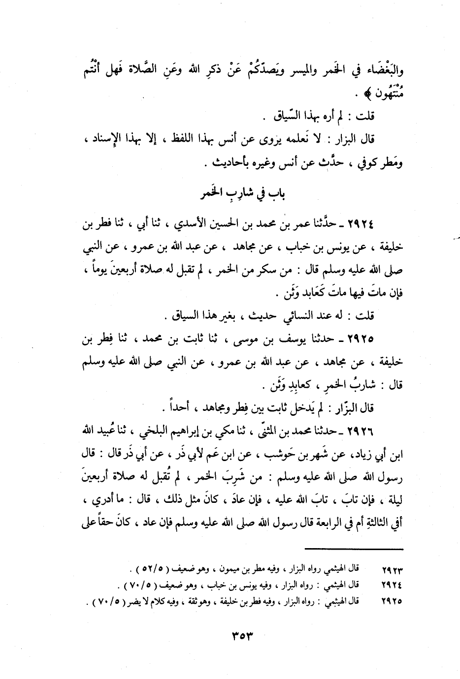 2926 - حَدَّثَنَا مُحَمَّدُ بْنُ الْمُثَنَّى، ثنا مَكِّيُّ بْنُ إِبْرَاهِيمَ الْبَلْخِيُّ، ثنا عُبَيْدُ اللَّهِ بْنُ أَبِي زِيَادٍ، عَنْ شَهْرِ بْنِ حَوْشَبٍ، عَنِ ابْنِ عَمٍّ لأَبِي ذَرٍّ، عَنْ أَبِي ذَرٍّ قَالَ: قَالَ رَسُولُ اللَّهِ صَلَّى اللَّهُ عَلَيْهِ وَسَلَّمَ: «مَنْ شَرِبَ الْخَمْرَ، لَمْ تُقْبَلْ لَهُ صَلاةٌ أَرْبَعِينَ لَيْلَةً، فَإِنْ تَابَ، تَابَ اللَّهُ عَلَيْهِ، فَإِنْ عَادَ، كَانَ مِثْلَ ذَلِكَ» قَالَ: مَا أَدْرِي، أَفِي الثَّالِثَةِ أَمْ فِي الرَّابِعَةِ قَالَ رَسُولُ اللَّهِ صَلَّى اللَّهُ عَلَيْهِ وَسَلَّمَ: «فَإِنْ عَادَ، كَانَ حَقًّا عَلَى