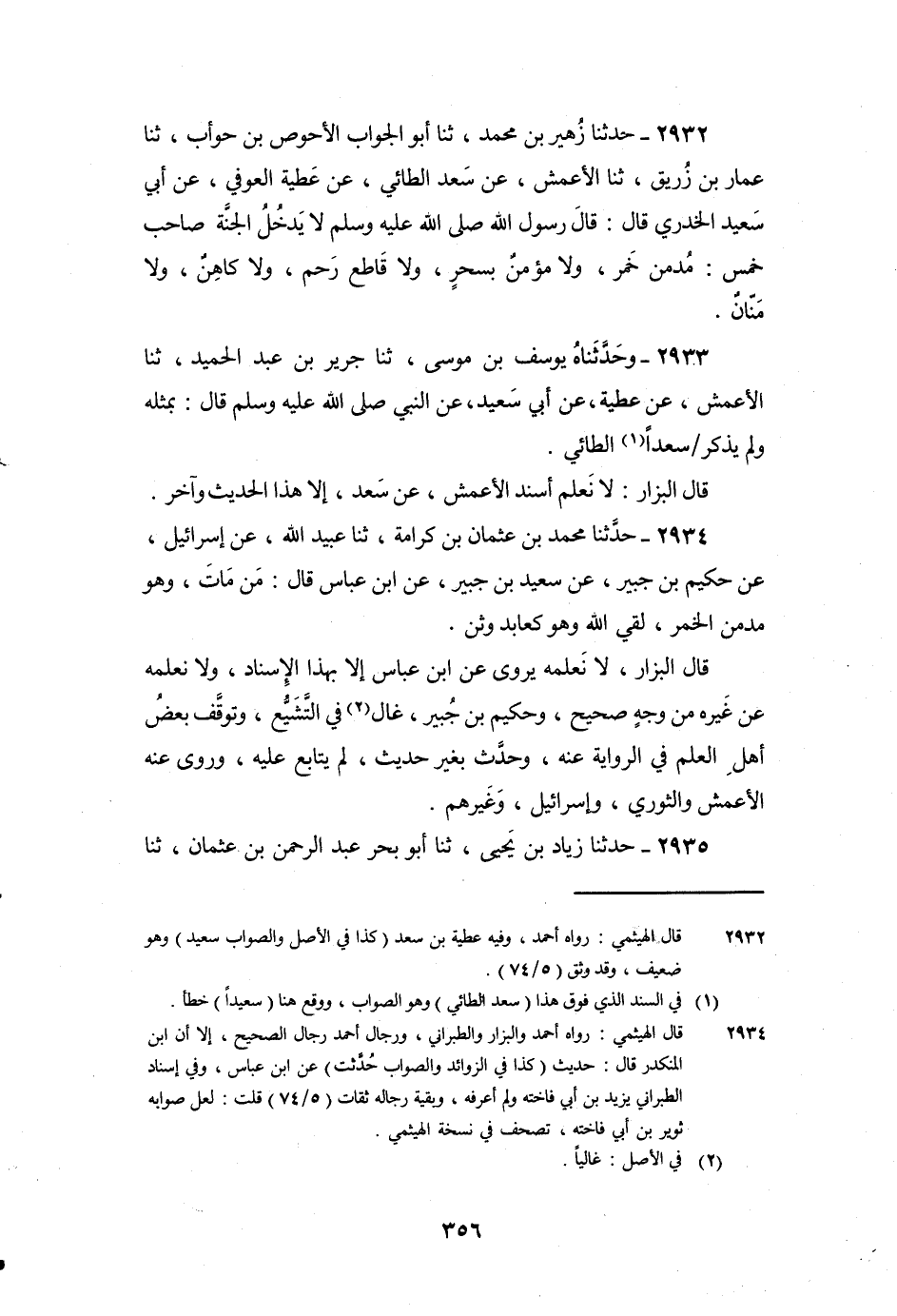 2932 - حَدَّثَنَا زُهَيْرُ بْنُ مُحَمَّدٍ، ثنا أَبُو الْجَوَّابِ الأَحْوَصِ بْنِ حَوْأَبٍ، ثنا عَمَّارُ بْنُ زُرَيْقٍ، ثنا الأَعْمَشُ، عَنْ سَعْدٍ الطَّائِيِّ، عَنْ عَطِيَّةَ الْعَوْفِيِّ، عَنْ أَبِي سَعِيدٍ الْخُدْرِيِّ قَالَ: قَالَ رَسُولُ اللَّهِ صَلَّى اللَّهُ عَلَيْهِ وَسَلَّمَ: " لا يَدْخُلُ الْجَنَّةَ صَاحِبُ خَمْسٍ: مُدْمِنُ خَمْرٍ، وَلا مُؤْمِنٌ بِسِحْرٍ، وَلا قَاطِعُ رَحِمٍ، وَلا كَاهِنٌ، وَلا مَنَّانٌ ".