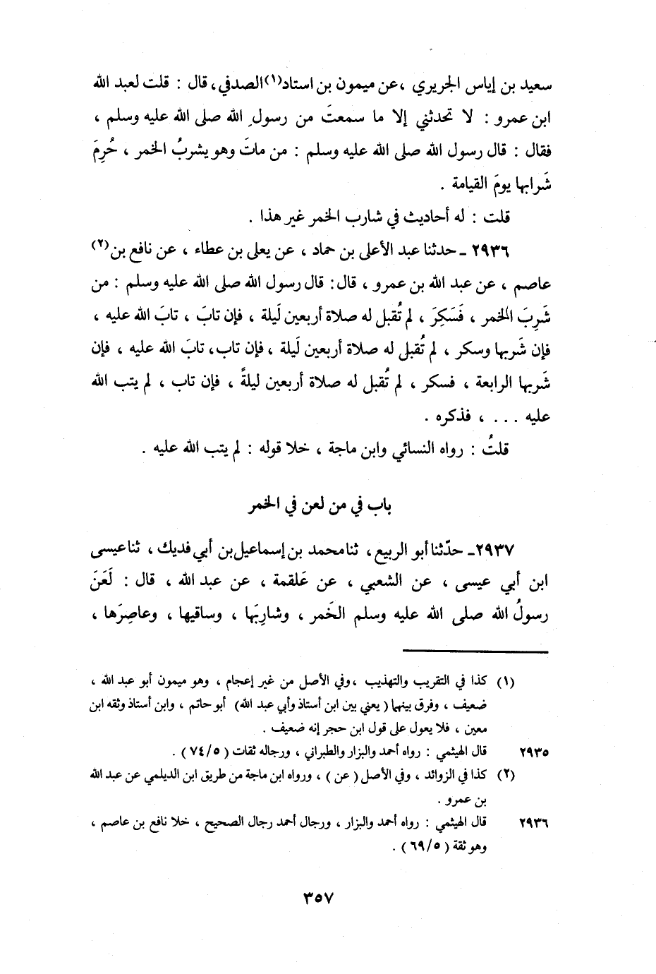 2936 - حَدَّثَنَا عَبْدُ الأَعْلَى بْنُ حَمَّادٍ، عَنْ يَعْلَى بْنِ عَطَاءٍ، عَنْ نَافِعِ بْنِ عَاصِمٍ، عَنْ عَبْدِ اللَّهِ بْنِ عَمْرٍو، قَالَ: قَالَ رَسُولُ اللَّهِ صَلَّى اللَّهُ عَلَيْهِ وَسَلَّمَ: «مَنْ شَرِبَ الْخَمْرَ، فَسَكِرَ، لَمْ تُقْبَلْ لَهُ صَلاةٌ أَرْبَعِينَ لَيْلَةً، فَإِنْ تَابَ، تَابَ اللَّهُ عَلَيْهِ، فَإِنْ شَرِبَهَا وَسَكِرَ، لَمْ تُقْبَلْ لَهُ صَلاةٌ أَرْبَعِينَ لَيْلَةً، فَإِنْ تَابَ، تَابَ اللَّهُ عَلَيْهِ، فَإِنْ شَرِبَهَا الرَّابِعَةَ، فَسَكِرَ، لَمْ تُقْبَلْ لَهُ صَلاةٌ أَرْبَعِينَ لَيْلَةً، فَإِنْ تَابَ، لَمْ يَتُبِ اللَّهُ عَلَيْهِ....