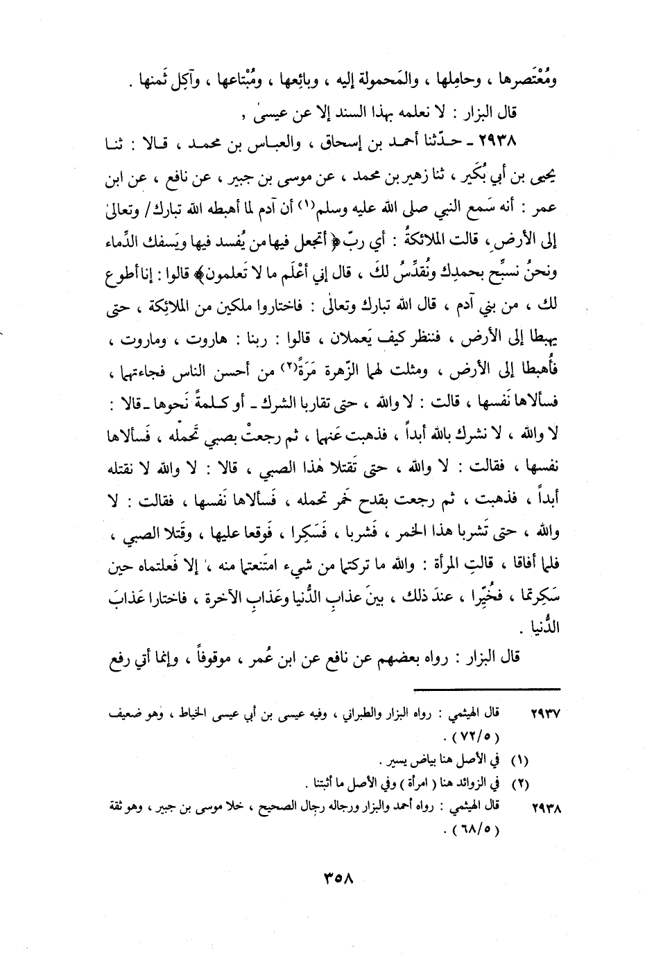 2938 - حَدَّثَنَا أَحْمَدُ بْنُ إِسْحَاقَ، وَالْعَبَّاسُ بْنُ مُحَمَّدٍ، قَالا: ثنا يَحْيَى بْنُ أَبِي بُكَيْرٍ، ثنا زُهَيْرُ بْنُ مُحَمَّدٍ، عَنْ مُوسَى بْنِ جُبَيْرٍ، عَنْ نَافِعٍ، عَنِ ابْنِ عُمَرَ: أَنَّهُ سَمِعَ النَّبِيَّ صَلَّى اللَّهُ عَلَيْهِ وَسَلَّمَ: " أَنَّ آدَمَ لَمَّا أَهْبَطَهُ اللَّهُ تَبَارَكَ وَتَعَالَى إِلَى الأَرْضِ، قَالَتِ الْمَلائِكَةُ: أَيْ رَبِّ {أَتَجْعَلُ فِيهَا مَنْ يُفْسِدُ فِيهَا وَيَسْفِكُ الدِّمَاءَ وَنَحْنُ نُسَبِّحُ بِحَمْدِكَ وَنُقَدِّسُ لَكَ قَالَ إِنِّي أَعْلَمُ مَا لا تَعْلَمُونَ} [البقرة: 30] قَالُوا: إِنَّا أَطْوَعُ لَكَ، مِنْ بَنِي آدَمَ، قَالَ اللَّهُ تَبَارَكَ وَتَعَالَى: فَاخْتَارُوا مَلَكَيْنِ مِنَ الْمَلائِكَةِ، حَتَّى يَهْبِطَا إِلَى الأَرْضِ، فَنَنْظُرُ كَيْفَ يَعْمَلانِ، قَالُوا: رَبَّنَا: هَارُوتُ، وَمَارُوتُ، فَأُهْبِطَا إِلَى الأَرْضِ، وَمُثِّلَتْ لَهُمَا الزّهْرَةُ امْرَأَةً مِنْ أَحْسَنِ النَّاسِ فَجَاءَتْهُمَا، فَسَأَلاهَا نَفْسَهَا، قَالَتْ: لا وَاللَّهِ، حَتَّى تُقَارِبَا الشِّرْكَ - أَوْ كَلِمَةً نَحْوَهَا - قَالا: لا وَاللَّهِ، وَلا نُشْرِكُ بِاللَّهِ أَبَدًا، فَذَهَبَتْ عَنْهُمَا، ثُمَّ رَجَعَتْ بِصَبِيٍّ تَحْمِلُهُ، فَسَأَلاهَا نَفْسَهَا، فَقَالَتْ: لا وَاللَّهِ، حَتَّى تَقْتُلا هَذَا الصَّبِيَّ، قَالا: لا وَاللَّهِ لا نَقْتُلُهُ أَبَدًا، فَذَهَبَتْ، ثُمَّ رَجَعَتْ بِقَدَحِ خَمْرٍ تَحْمِلُهُ، فَسَأَلاهَا نَفْسَهَا، فَقَالَتْ: لا وَاللَّهِ، حَتَّى تَشْرَبَا هَذَا الْخَمْرَ، فَشَرِبَا، فَسَكِرَا، فَوَقَعَا عَلَيْهَا، وَقَتَلا الصَّبِيَّ، فَلَمَّا أَفَاقَا، قَالَتِ الْمَرْأَةُ: وَاللَّهِ مَا تَرَكْتُمَا مِنْ شَيْءٍ امْتَنَعْتُمَا مِنْهُ، إِلا فَعَلْتُمَاهُ حِينَ سَكِرْتُمَا، فَخُيِّرَا عِنْدَ ذَلِكَ بَيْنَ عَذَابِ الدُّنْيَا وَعَذَابِ الآخِرَةِ، فَاخْتَارَا عَذَابَ الدُّنْيَا ".
