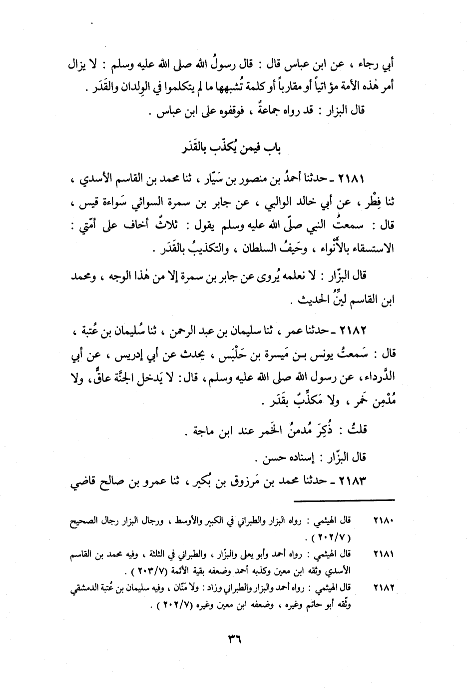 2181 - حَدَّثَنَا أَحْمَدُ بْنُ مَنْصُورِ بْنِ سَيَّارٍ، ثنا مُحَمَّدُ بْنُ الْقَاسِمِ الأَسَدِيُّ، ثنا فِطْرٌ، عَنْ أَبِي خَالِدٍ الْوَالِبِيِّ، عَنْ جَابِرِ بْنِ سَمُرَةَ السُّوَائِيِّ سُوَاءَةَ قَيْسٍ، قَالَ: سَمِعْتَ النَّبِيَّ صَلَّى اللَّهُ عَلَيْهِ وَسَلَّمَ يَقُولُ: " ثَلاثٌ أَخَافُ عَلَى أُمَّتِي: الاسْتِسْقَاءُ بِالأَنْوَاءِ، وَحَيفُ السُّلْطَانِ، وَالتَّكْذِيبُ بِالْقَدَرِ ".
