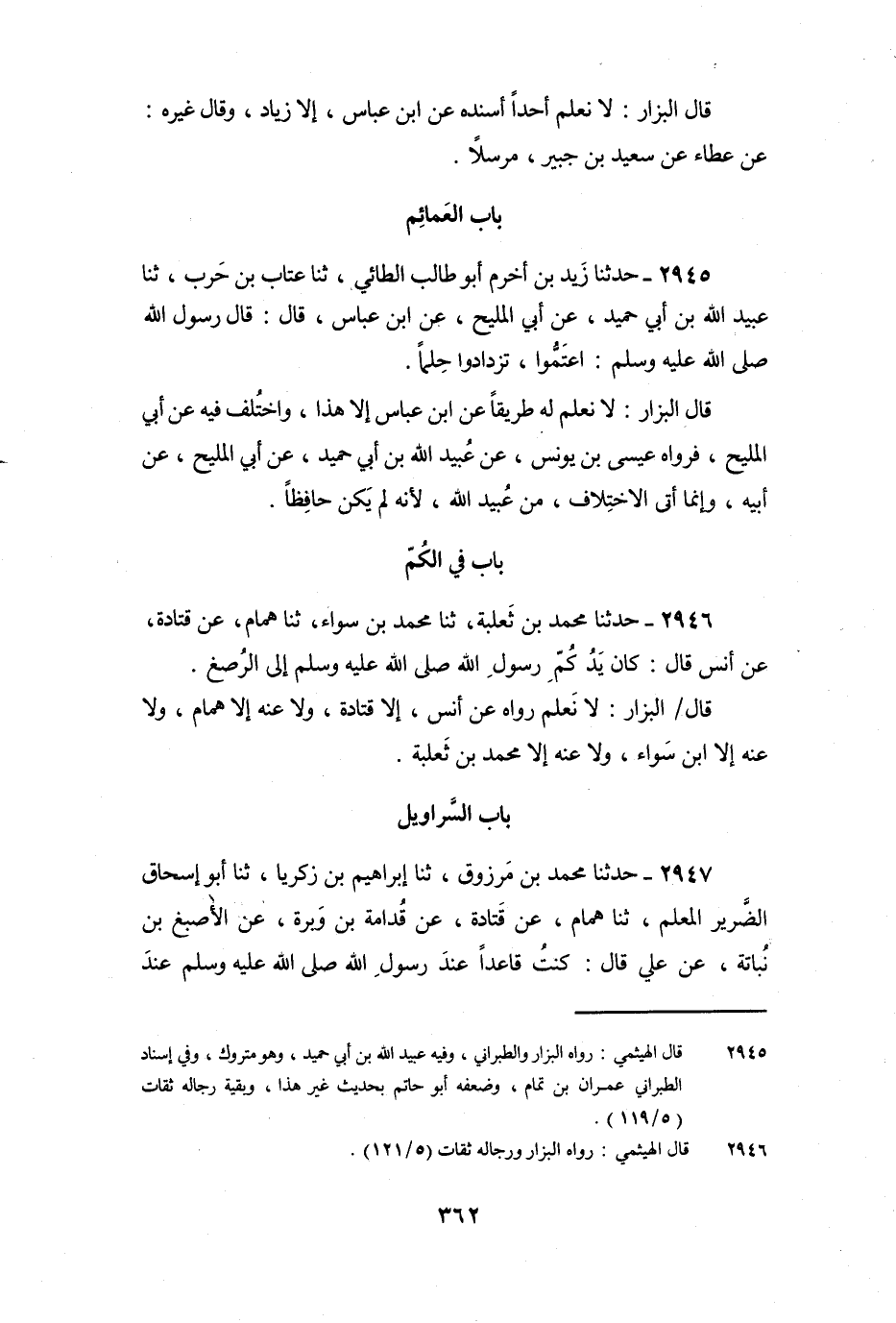 2945 - حَدَّثَنَا زَيْدُ بْنُ أَخْرَمَ أَبُو طَالِبٍ الطَّائِيُّ، ثنا عَتَّابُ بْنُ حَرْبٍ، ثنا عُبَيْدُ اللَّهِ بْنُ أَبِي حُمَيْدٍ، عَنْ أَبِي الْمُلَيْحِ، عَنِ ابْنِ عَبَّاسٍ، قَالَ: قَالَ رَسُولُ اللَّهِ صَلَّى اللَّهُ عَلَيْهِ وَسَلَّمَ: «اعْتَمُّوا، تَزْدَادُوا حِلْمًا» .