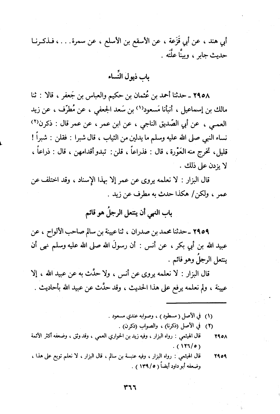 2958 - حَدَّثَنَا أَحْمَدُ بْنُ عُثْمَانَ بْنِ حَكِيمٍ , وَالْعَبَّاسُ بْنُ جَعْفَرٍ، قَالا: ثنا مَالِكُ بْنُ إِسْمَاعِيلَ، أَنْبَأَنَا مَسْعُودُ بْنُ سَعْدٍ الْجُعْفِيُّ، عَنْ مُطَرِّفٍ، عَنْ زَيْدٍ الْعَمِّيِّ، عَنْ أَبِي الصِّدِّيقِ النَّاجِيِّ، عَنِ ابْنِ عُمَرَ، عَنْ عُمَرَ قَالَ: ذَكَرْنَ نِسَاءُ النَّبِيِّ صَلَّى اللَّهُ عَلَيْهِ وَسَلَّمَ مَا يُدْلِينَ مِنَ الثِّيَابِ، قَالَ شِبْرًا: فَقُلْنَ: شِبْرًا قَلِيلٌ، تَخْرُجُ مِنْهُ الْعَوْرَةُ، قَالَ: فَذِرَاعًا، قُلْنَ: تَبْدُو أَقْدَامُهُنَ، قَالَ: ذِرَاعًا، لا يَزِدْنَ عَلَى ذَلِكَ.