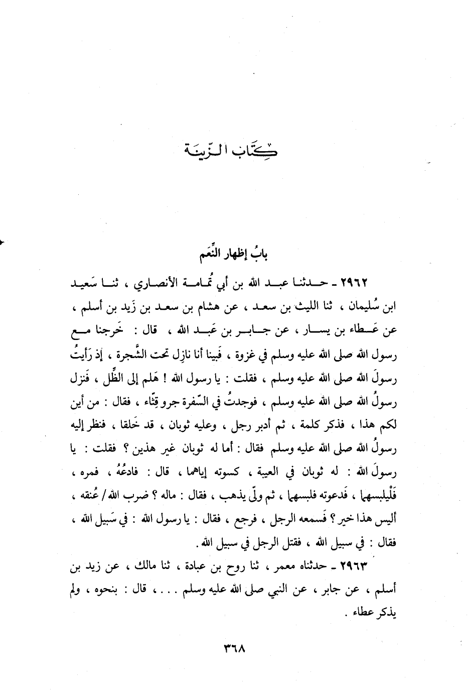 2962 - حَدَّثَنَا عَبْدُ اللَّهِ بْنُ أَبِي ثُمَامَةَ الأَنْصَارِيُّ، ثنا سَعِيدُ بْنُ سُلَيْمَانَ، ثنا اللَّيْثُ بْنُ سَعْدٍ، عَنْ هِشَامِ بْنِ سَعْدِ، عَنْ زَيْدِ بْنِ أَسْلَمَ، عَنْ عَطَاءِ بْنِ يَسَارٍ، عَنْ جَابِرِ بْنِ عَبْدِ اللَّهِ، قَالَ: خَرَجْنَا مَعَ رَسُولِ اللَّهِ صَلَّى اللَّهُ عَلَيْهِ وَسَلَّمَ فِي غَزْوَةٍ، فَبَيْنَا أَنَا نَازِلٌ تَحْتَ الشَّجَرَةِ، إِذْ رَأَيْتُ رَسُولَ اللَّهِ صَلَّى اللَّهُ عَلَيْهِ وَسَلَّمَ، فَقُلْتُ: يَا رَسُولَ اللَّهِ! هَلُمَّ إِلَى الظِّلِّ، فَنَزَلَ رَسُولُ اللَّهِ صَلَّى اللَّهُ عَلَيْهِ وَسَلَّمَ، فَوَجَدْتُ فِي السُّفْرَةِ جِرْوَ قِثَّاءٍ، فَقَالَ: مِنْ أَيْنَ لَكُمْ هَذَا، فَذَكَرَ كَلِمَةً، ثُمَّ أَدْبَرَ رَجُلٌ، وَعَلَيْهِ ثَوْبَانِ، قَدْ خَلَقَا، فَنَظَرَ إِلَيْهِ رَسُولُ اللَّهِ صَلَّى اللَّهُ عَلَيْهِ وَسَلَّمَ فَقَالَ: «أَمَا لَهُ ثَوْبَانِ غَيْرُ هَذَيْنِ؟» فَقُلْتُ: يَا رَسُولَ اللَّهِ صَلَّى اللَّهُ عَلَيْهِ وَسَلَّمَ: لَهُ ثَوْبَانِ فِي الْعَيْبَةِ، كَسَوْتُهُ إِيَّاهُمَا، قَالَ: «فَادْعُهُ، فَمُرْهُ فَلْيَلْبَسْهُمَا» فَدَعَوْتُهُ فَلَبِسَهُمَا، ثُمَّ وَلَّى يَذْهَبُ، فَقَالَ: «مَا لَهُ؟ ضَرَبَ اللَّهُ عُنُقَهُ، أَلَيْسَ هَذَا خَيْرٌ؟» فَسَمِعَهُ الرَّجُلُ فَرَجَعَ، فَقَالَ: يَا رَسُولَ اللَّهِ: فِي سَبِيلِ اللَّهِ، فَقَالَ: «فِي سَبِيلِ اللَّهِ» فَقُتِلَ الرَّجُلُ فِي سَبِيلِ اللَّهِ.
