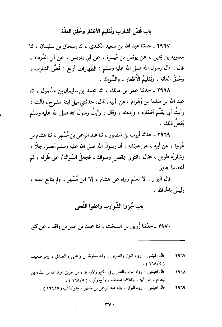 2969 - حَدَّثَنَا أَيُّوبُ بْنُ مَنْصُورٍ، ثنا عَبْدُ الرَّحْمَنِ بْنُ مُسْهِرٍ، ثنا هِشَامُ بْنُ عُرْوَةَ، عَنْ أَبِيهِ، عَنْ عَائِشَةَ: أَنَّ رَسُولَ اللَّهِ صَلَّى اللَّهُ عَلَيْهِ وَسَلَّمَ أَبْصَرَ رَجُلا، وَشَارِبُهُ طَوِيلٌ، فَقَالَ: «ائْتُونِي بِمِقَصٍّ وَسِوَاكٍ» ، فَجَعَلَ السِّوَاكَ عَلَى طَرْفِهِ، ثُمَّ أَخَذَ مَا جَاوَزَ.