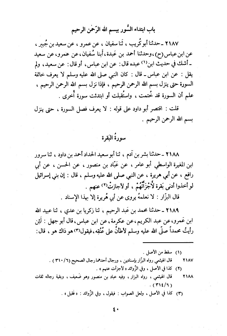 2187 - حَدَّثَنَا أَبُو كُرَيْبٍ، ثنا سُفْيَانُ، عَنْ عَمْرٍو، عَنْ سَعِيدِ بْنِ جُبَيْرٍ، عَنِ ابْنِ عَبَّاسٍ (ح) ، وَحَدَّثَنَا أَحْمَدُ بْنُ عَبْدَةَ، أبنا سُفْيَانُ، عَنْ عَمْرٍو، عَنْ سَعِيدٍ - أَشُكُّ فِي حَدِيثِ ابْنِ عَبْدَةَ قَالَ: عَنِ ابْنِ عَبَّاسٍ، أَوْ قَالَ: عَنْ سَعِيدٍ، وَلَمْ يَقُلْ: عَنِ ابْنِ عَبَّاسٍ - قَالَ: كَانَ النَّبِيُّ صَلَّى اللَّهُ عَلَيْهِ وَسَلَّمَ لا يَعْرِفُ خَاتِمَةَ السُّورَةِ حَتَّى يَنْزِلَ بِسْمِ اللَّهِ الرَّحْمَنِ الرَّحِيمِ، فَإِذَا نَزَلَ بِسْمِ اللَّهِ الرَّحْمَنِ الرَّحِيمِ، عَلِمَ أَنَّ السُّورَةَ قَدْ خُتِمَتْ، وَاسْتُقْبِلَتْ أَوِ ابْتُدِئَتْ سُورَةٌ أُخْرَى.