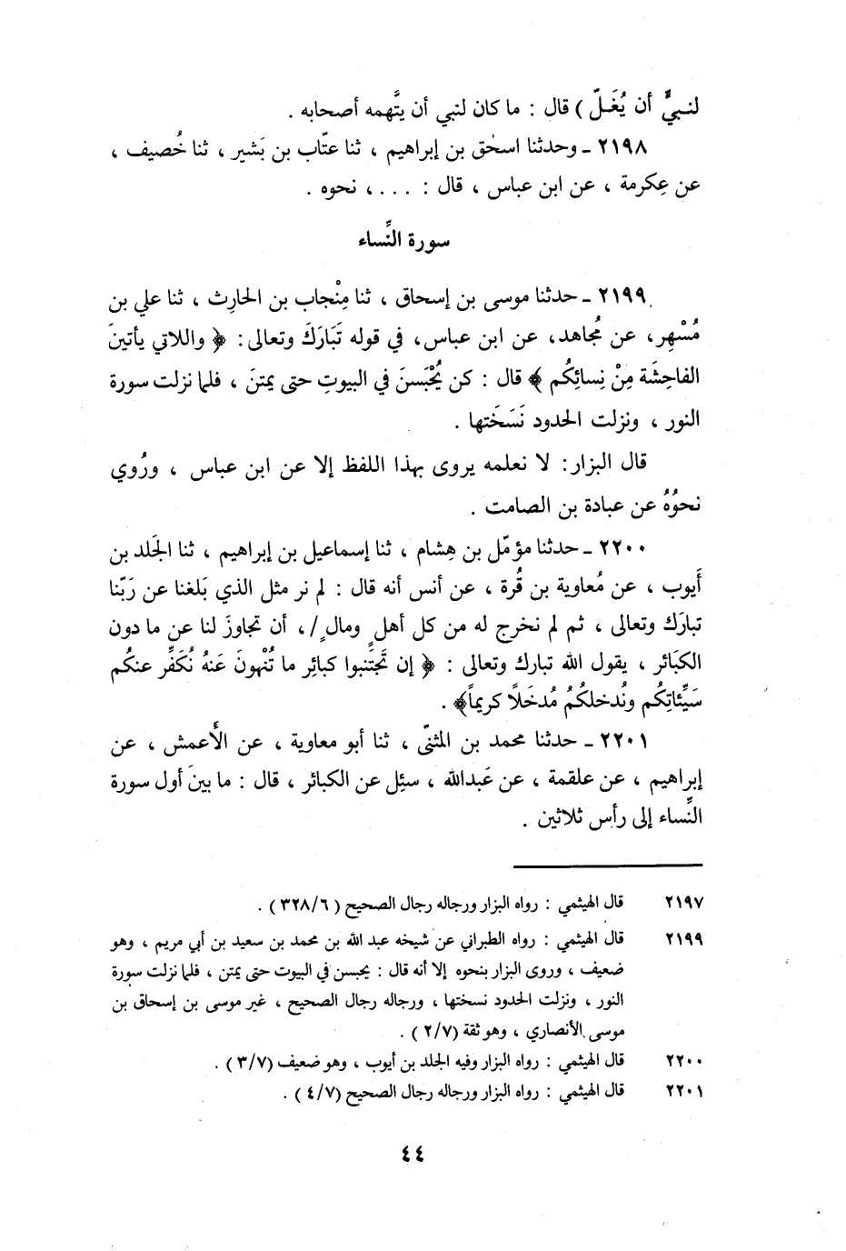 2201 - حَدَّثَنَا مُحَمَّدُ بْنُ الْمُثَنَّى، ثنا أَبُو مُعَاوِيَةَ، عَنِ الأَعْمَشِ، عَنْ إِبْرَاهِيمَ، عَنْ عَلْقَمَةَ، عَنْ عَبْدِ اللَّهِ، سُئِلَ عَنِ الْكَبَائِرِ، قَالَ: مَا بَيْنَ أَوَّلِ سُورَةِ النِّسَاءِ إِلَى رَأْسِ ثَلاثِينَ.