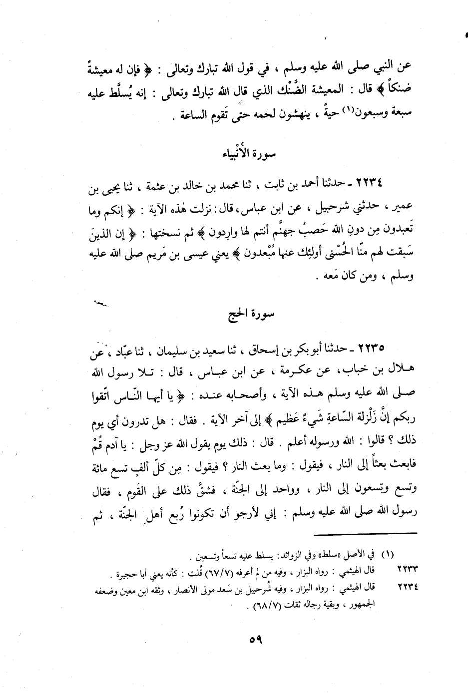 2234 - حَدَّثَنَا أَحْمَدُ بْنُ ثَابِتٍ، ثنا مُحَمَّدُ بْنُ خَالِدِ بْنِ عَثْمَةَ، ثنا يَحْيَى بْنُ عُمَيْرٍ، حَدَّثَنِي شُرَحْبِيلُ، عَنِ ابْنِ عَبَّاسٍ، قَالَ: نَزَلَتْ هَذِهِ الآيَةُ: {إِنَّكُمْ وَمَا تَعْبُدُونَ مِنْ دُونِ اللَّهِ حَصَبُ جَهَنَّمَ أَنْتُمْ لَهَا وَارِدُونَ} [الأنبياء: 98] ثُمَّ نَسَخَتْهَا: {إِنَّ الَّذِينَ سَبَقَتْ لَهُمْ مِنَّا الْحُسْنَى أُولَئِكَ عَنْهَا مُبْعَدُونَ} [الأنبياء: 101] يَعْنِي: عِيسَى ابْنَ مَرْيَمَ صَلَّى اللَّهُ عَلَيْهِ وَسَلَّمَ، وَمَنْ كَانَ مَعَهُ.