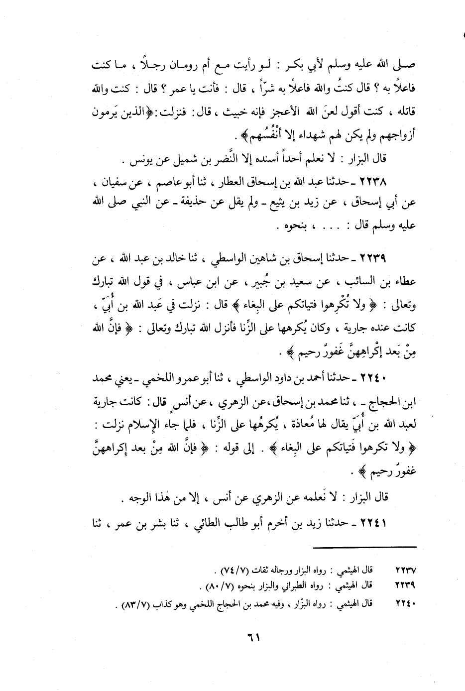 2239 - حَدَّثَنَا إِسْحَاقُ بْنُ شَاهِينَ الْوَاسِطِيُّ، ثنا خَالِدُ بْنُ عَبْدِ اللَّهِ، عَنْ عَطَاءِ بْنِ السَّائِبِ، عَنْ سَعِيدِ بْنِ جُبَيْرٍ، عَنِ ابْنِ عَبَّاسٍ، فِي قَوْلِ اللَّهِ تَبَارَكَ وَتَعَالَى: {وَلا تُكْرِهُوا فَتَيَاتِكُمْ عَلَى الْبِغَاءِ} [النور: 33] قَالَ: نَزَلَتْ فِي عَبْدِ اللَّهِ بْنِ أُبَيٍّ، كَانَتْ عِنْدَهُ جَارِيَةٌ، وَكَانَ يُكْرِهُهَا عَلَى الزِّنَا فَأَنْزَلَ اللَّهُ تَبَارَكَ وَتَعَالَى: {فَإِنَّ اللَّهَ مِنْ بَعْدِ إِكْرَاهِهِنَّ غَفُورٌ رَحِيمٌ} [النور: 33] .