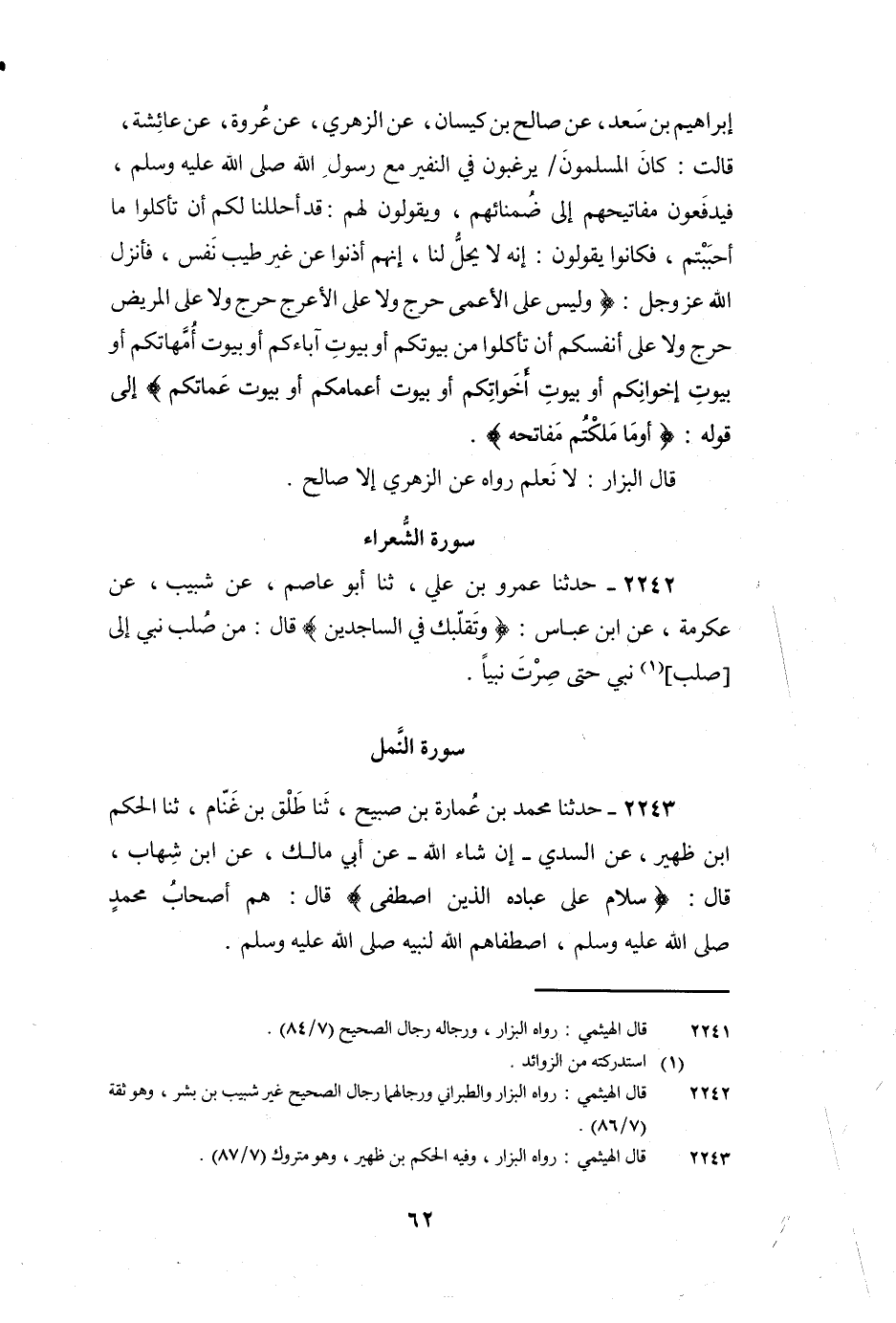 2243 - حَدَّثَنَا مُحَمَّدُ بْنُ عُمَارَةَ بْنِ صُبَيْحٍ، ثنا طَلْقُ بْنُ غَنَّامٍ، ثنا الْحَكَمُ بْنُ ظُهَيْرٍ، عَنِ السُّدِّيِّ - إِنْ شَاءَ اللَّهُ - عَنْ أَبِي مَالِكٍ، عَنِ ابْنِ شِهَابٍ، قَالَ: {وَسَلامٌ عَلَى عِبَادِهِ الَّذِينَ اصْطَفَى} [النمل: 59] قَالَ: هُمْ أَصْحَابُ مُحَمَّدٍ صَلَّى اللَّهُ عَلَيْهِ وَسَلَّمَ، اصْطَفَاهُمُ اللَّهُ لِنَبِيِّهِ صَلَّى اللَّهُ عَلَيْهِ وَسَلَّمَ.