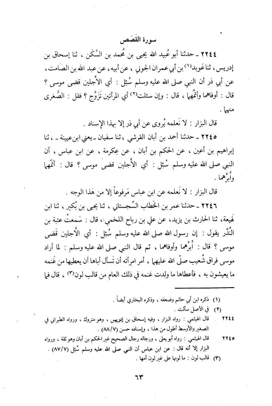 2245 - حَدَّثَنَا أَحْمَدُ بْنُ أَبَانٍ الْقُرَشِيُّ، ثنا سُفْيَانُ - يَعْنِي: ابْنَ عُيَيْنَةَ -، ثنا إِبْرَاهِيمُ بْنُ أَعْيَنَ، عَنِ الْحَكَمِ بْنِ أَبَانٍ، عَنْ عِكْرِمَةَ، عَنِ ابْنِ عَبَّاسٍ، أَنَّ النَّبِيَّ صَلَّى اللَّهُ عَلَيْهِ وَسَلَّمَ سُئِلَ: أَيُّ الأَجَلَيْنِ قَضَى مُوسَى؟ قَالَ: «أَتَمُّهُمَا وَأَبَرُّهُمَا» .