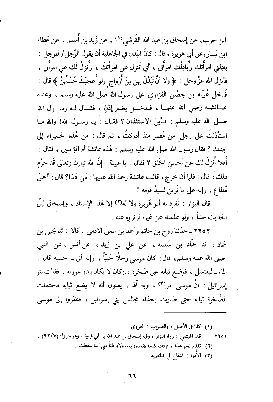 بْنُ حَرْبٍ، عَنْ إِسْحَاقَ بْنِ عَبْدِ اللَّهِ الْقُرَشِيِّ، عَنْ زَيْدِ بْنِ أَسْلَمَ، عَنْ عَطَاءِ بْنِ يَسَارٍ، عَنْ أَبِي هُرَيْرَةَ، قَالَ: كَانَ الْبَدَلُ فِي الْجَاهِلِيَّةِ أَنْ يَقُولَ الرَّجُلُ لِلرَّجُلِ: بَادِلْنِي امْرَأَتَكَ وَأُبَادِلُكَ امْرَأَتِي، أَيْ: تَنْزِلُ عَنِ امْرَأَتِكَ، وَأَنْزِلُ لَكَ عَنِ امْرَأَتِي، فَأَنْزَلَ اللَّهُ عَزَّ وَجَلَّ: {وَلا أَنْ تَبَدَّلَ بِهِنَّ مِنْ أَزْوَاجٍ وَلَوْ أَعْجَبَكَ حُسْنُهُنَّ} [الأحزاب: 52]