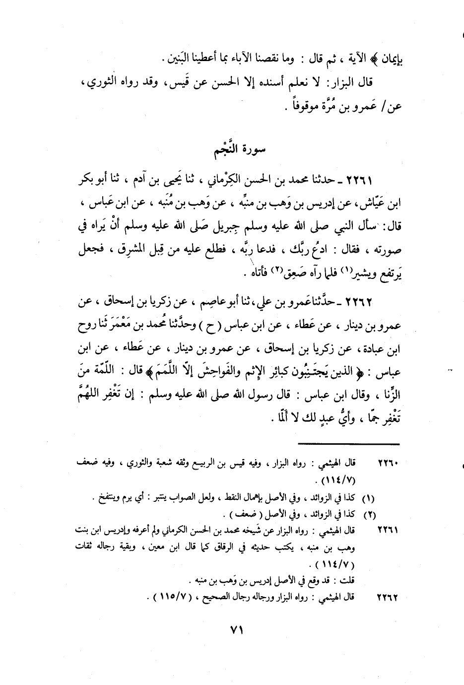 2261 - حَدَّثَنَا مُحَمَّدُ بْنُ الْحَسَنِ الْكَرْمَانِيُّ، ثنا يَحْيَى بْنُ آدَمَ، ثنا أَبُو بَكْرِ بْنُ عَيَّاشٍ، عَنْ إِدْرِيسَ بْنِ وَهْبِ بْنِ مُنَبِّهٍ، عَنْ وَهْبِ بْنِ مُنَبِّهٍ، عَنِ ابْنِ عَبَّاسٍ، قَالَ: سَأَلَ النَّبِيُّ صَلَّى اللَّهُ عَلَيْهِ وَسَلَّمَ جِبْرِيلَ صَلَّى اللَّهُ عَلَيْهِ وَسَلَّمَ أَنْ يَرَاهُ فِي صُورَتِهِ، فَقَالَ: ادْعُ رَبَّكَ، فَدَعَا رَبَّهُ، فَطَلَعَ عَلَيْهِ مِنْ قِبَلِ الْمَشْرِقِ، فَجَعَلَ يَرْتَفِعُ وَيُشِيرُ، فَلَمَّا رَآهُ صَعِقَ , فَأَتَاهُ.