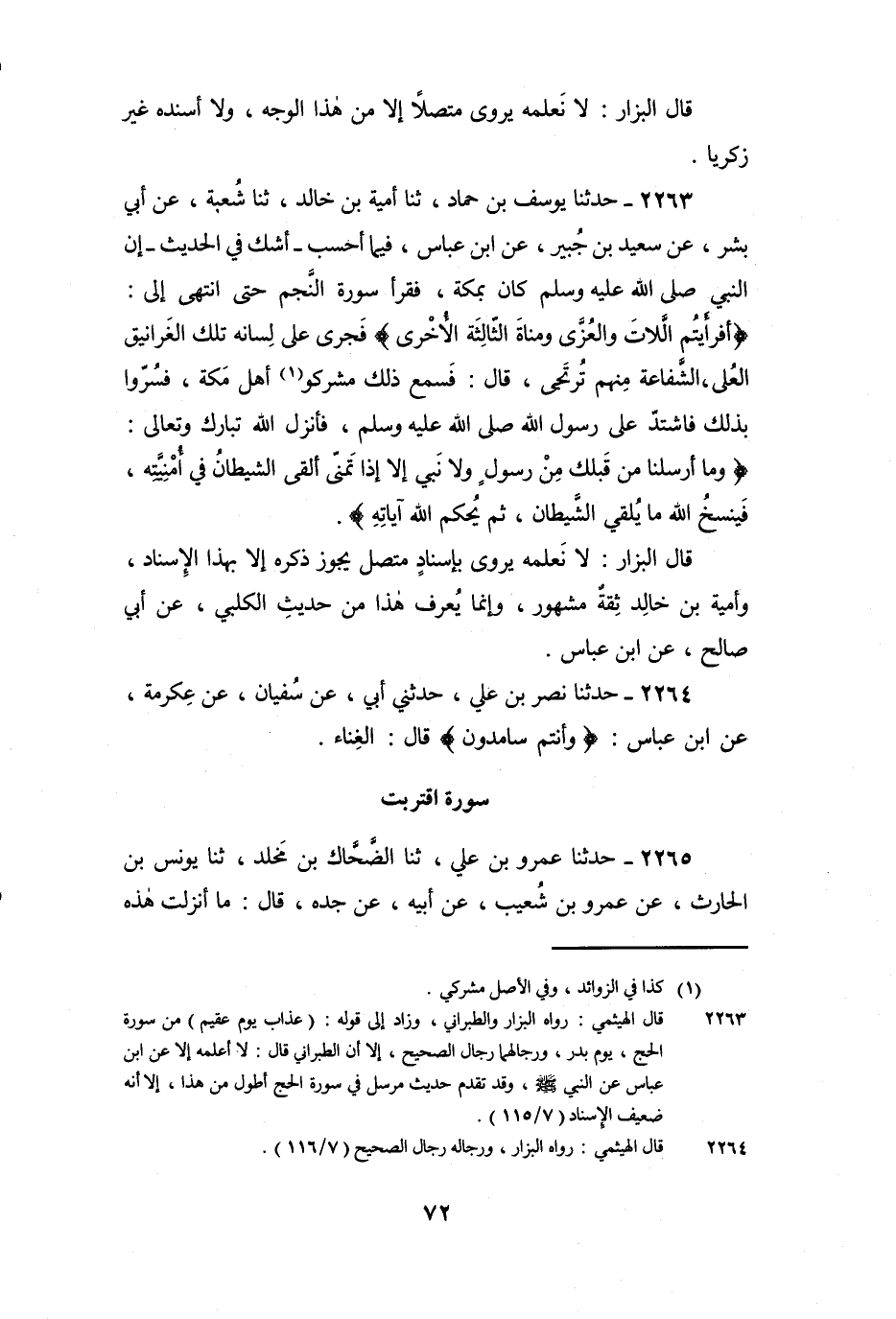2263 - حَدَّثَنَا يُوسُفُ بْنُ حَمَّادٍ، ثنا أُمَيَّةُ بْنُ خَالِدٍ، ثنا شُعْبَةُ، عَنْ أَبِي بِشْرٍ، عَنْ سَعِيدِ بْنِ جُبَيْرٍ، عَنِ ابْنِ عَبَّاسٍ، فِيمَا أَحْسِبُ - أَشُكُّ فِي الْحَدِيثِ - إِنَّ النَّبِيَّ صَلَّى اللَّهُ عَلَيْهِ وَسَلَّمَ كَانَ بِمَكَّةَ، فَقَرَأَ سُورَةَ النَّجْمِ حَتَّى انْتَهَى إِلَى: {أَفَرَأَيْتُمُ اللَّاتَ وَالْعُزَّى {19} وَمَنَاةَ الثَّالِثَةَ الأُخْرَى {20} } [النجم: 19-20] فَجَرَى عَلَى لِسَانِهِ: «تِلْكَ الْغَرَانِيقُ الْعُلَى، الشَّفَاعَةُ مِنْهُمْ تُرْتَجَى» ، قَالَ: فَسَمِعَ ذَلِكَ مُشْرِكُو أَهْلِ مَكَّةَ، فَسُرُّوا بِذَلِكَ فَاشْتَدَّ عَلَى رَسُولِ اللَّهِ صَلَّى اللَّهُ عَلَيْهِ وَسَلَّمَ، فَأَنْزَلَ اللَّهُ تَبَارَكَ وَتَعَالَى: {وَمَا أَرْسَلْنَا مِنْ قَبْلِكَ مِنْ رَسُولٍ وَلا نَبِيٍّ إِلا إِذَا تَمَنَّى أَلْقَى الشَّيْطَانُ فِي أُمْنِيَّتِهِ فَيَنْسَخُ اللَّهُ مَا يُلْقِي الشَّيْطَانُ ثُمَّ يُحْكِمُ اللَّهُ آيَاتِهِ} [الحج: 52] .