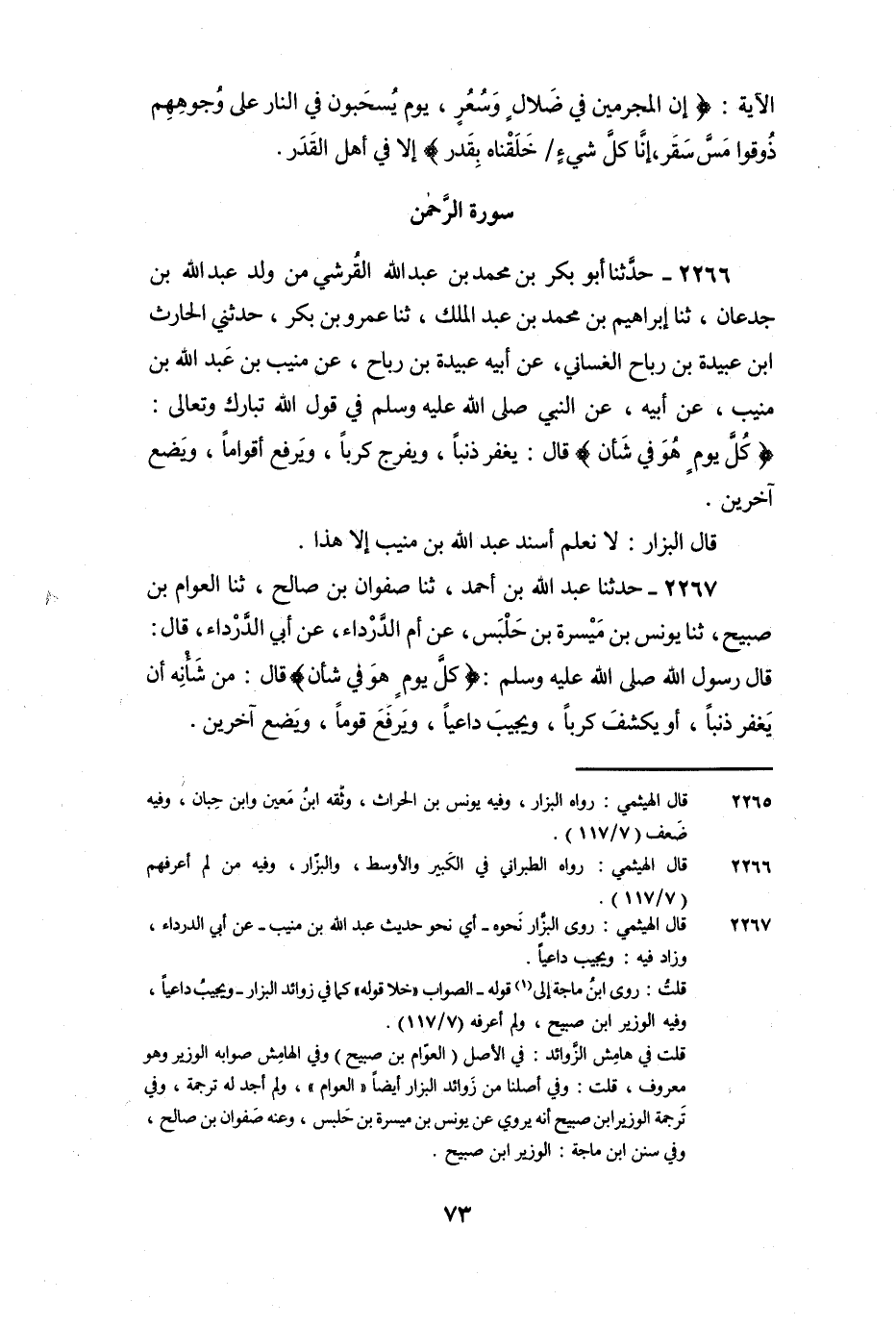 2267 - حَدَّثَنَا عَبْدُ اللَّهِ بْنُ أَحْمَدَ، ثنا صَفْوَانُ بْنُ صَالِحٍ، ثنا الْعَوَّامُ بْنُ صُبَيْحٍ، ثنا يُونُسُ بْنُ مَيْسَرَةَ بْنِ حَلْبَسٍ، عَنْ أُمِّ الدَّرْدَاءِ، عَنْ أَبِي الدَّرْدَاءِ، قَالَ: قَالَ رَسُولُ اللَّهِ صَلَّى اللَّهُ عَلَيْهِ وَسَلَّمَ: " {كُلَّ يَوْمٍ هُوَ فِي شَأْنٍ} [الرحمن: 29] قَالَ: مِنْ شَأْنِهِ أَنْ يَغْفِرَ ذَنْبًا، أَوْ يَكْشِفَ كَرْبًا، وَيُجِيبَ دَاعِيًا، وَيَرْفَعَ قَوْمًا، وَيَضَعَ آخَرِينَ ".