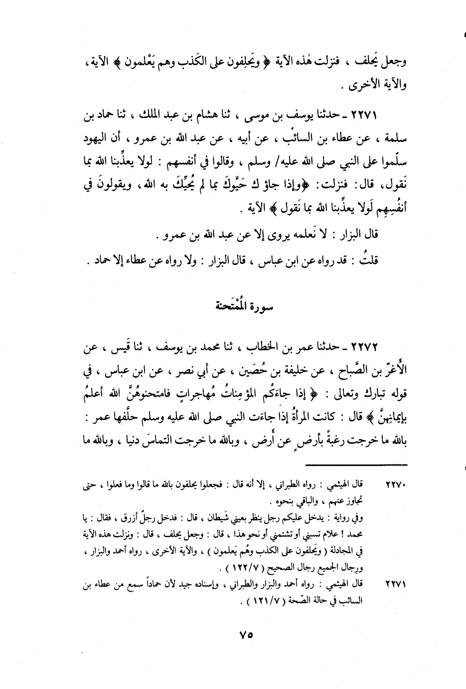 2271 - حَدَّثَنَا يُوسُفُ بْنُ مُوسَى، ثنا هِشَامُ بْنُ عَبْدِ الْمَلِكِ، ثنا حَمَّادُ بْنُ سَلَمَةَ، عَنْ عَطَاءِ بْنِ السَّائِبِ، عَنْ أَبِيهِ، عَنْ عَبْدِ اللَّهِ بْنِ عَمْرٍو، أَنَّ الْيَهُودَ سَلَّمُوا عَلَى النَّبِيِّ صَلَّى اللَّهُ عَلَيْهِ وَسَلَّمَ، وَقَالُوا فِي أَنْفُسِهِمْ: لَوْلا يُعَذِّبُنَا اللَّهُ بِمَا نَقُولُ: قَالَ: فَنَزَلَتْ: {وَإِذَا جَاءُوكَ حَيَّوْكَ بِمَا لَمْ يُحَيِّكَ بِهِ اللَّهُ وَيَقُولُونَ فِي أَنْفُسِهِمْ لَوْلا يُعَذِّبُنَا اللَّهُ بِمَا نَقُولُ} [المجادلة: 8] الآيَةَ.
