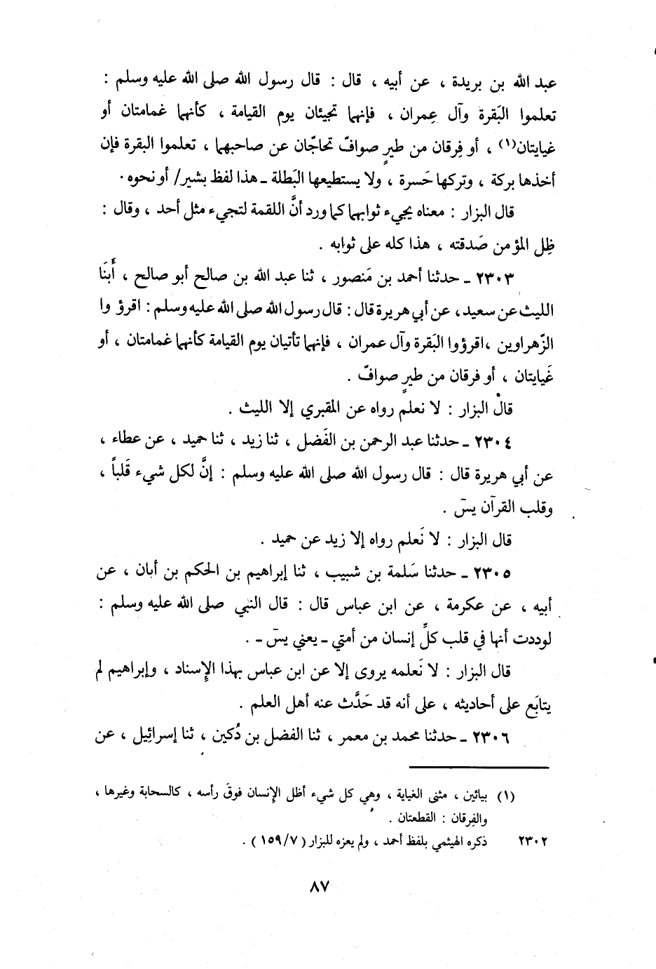 2303 - حَدَّثَنَا أَحْمَدُ بْنُ مَنْصُورٍ، ثنا عَبْدُ اللَّهِ بْنُ صَالِحٍ أَبُو صَالِحٍ، أبنا اللَّيْثُ عَنْ سَعِيدٍ، عَنْ أَبِي هُرَيْرَةَ قَالَ: قَالَ رَسُولُ اللَّهِ صَلَّى اللَّهُ عَلَيْهِ وَسَلَّمَ: «اقْرَءُوا الزَّهْرَاوَيْنِ، اقْرَءُوا الْبَقَرَةَ , وَآلَ عِمْرَانَ، فَإِنَّهُمَا تَأْتِيَانِ يَوْمَ الْقِيَامَةِ كَأَنَّهُمَا غَمَامَتَانِ، أَوْ غَيَايَتَانِ، أَوْ فِرْقَانِ مِنْ طَيْرٍ صَوَافٍّ» .